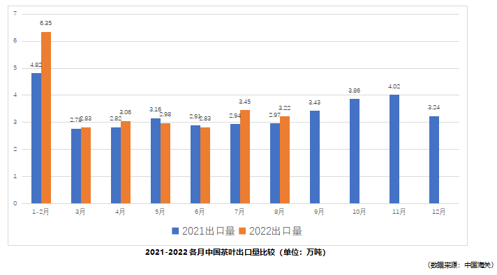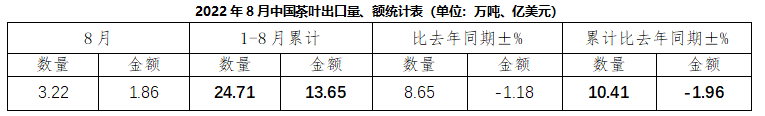 2022年8月中国茶叶出口情况简报 据中国海关数据,2022年8月,中国茶叶出口量为3.22万吨,同比增长8.65%,出口额为1.86亿美元,同比减少1.18%,出口均价为5.76美元/千克,同比降低9.04%。 截至8月,2022年中国茶叶累计出口量为24.71万吨,同比增长10.41%,累计出口额为13.65亿美元,同比减少1.96%,1-8月出口均价为5.52美元/千克,比去年同期降低11.21%。 分茶类看。2022年1-8月,中国绿茶出口量为20.82万吨,占总出口量比重为84.3%,增长2.03万吨,同比增长10.8%;红茶出口量为1.97万吨,占总出口量比重为8.0%,增长1347吨,增幅7.3%;乌龙茶出口量为1.34万吨,占总出口量比重为5.4%,增长1375吨,增幅11.4%;花茶出口量为4070吨,占总出口量比重为1.6%,增长492吨,增幅13.7%;普洱茶出口量为1396吨,占总出口量比重为0.6%;黑茶出口量为247吨,占总出口量比重为0.1%。 来自:中国茶叶流通协会 更多阅读:2022年7月中国茶叶出口情况简报中国茶叶流通协会:2023年1-2月中国茶叶出口情况简报2022年11月中国茶叶出口情况简报中国茶叶流通协会:2023年3月中国茶叶出口情况简报2022年4月中国茶叶出口情况简报中国茶叶流通协会:2022年6月中国茶叶出口情况简报中国茶叶流通协会:2021年6月中国茶叶出口情况简报中国茶叶流通协会:2023年5月中国茶叶出口情况简报中国茶叶流通协会:2022年10月中国茶叶出口情况简报2023年6月中国茶叶出口情况简报中国海关:2022年5月中国茶叶出口情况简报中国茶叶流通协会:2022年1-2月中国茶叶出口情况简报中国茶叶流通协会:2021年9月中国茶叶出口情况简报中国茶叶流通协会:2024年4月中国茶叶出口情况简报中国茶叶流通协会:2023 年 3 月中国茶叶出口情况简报