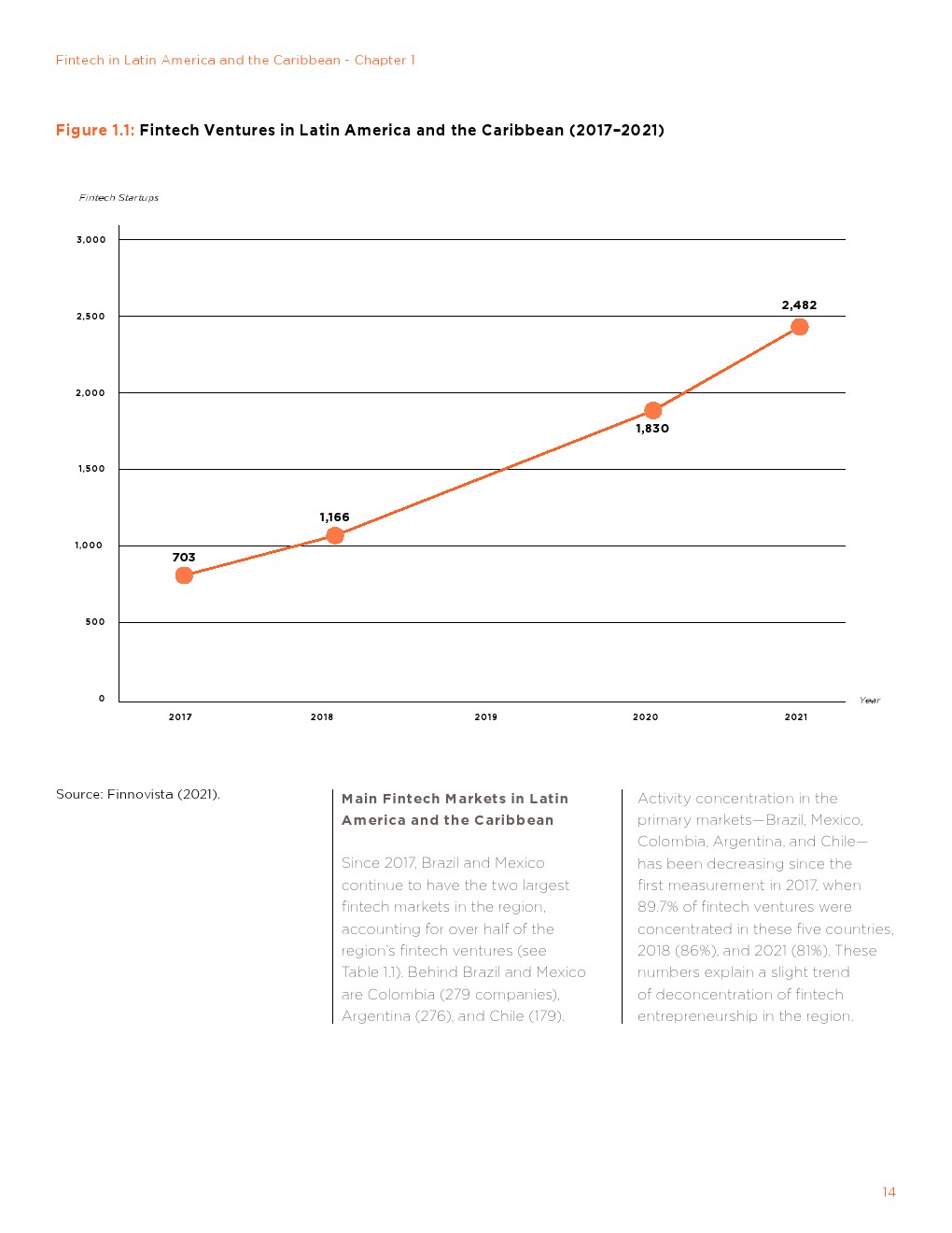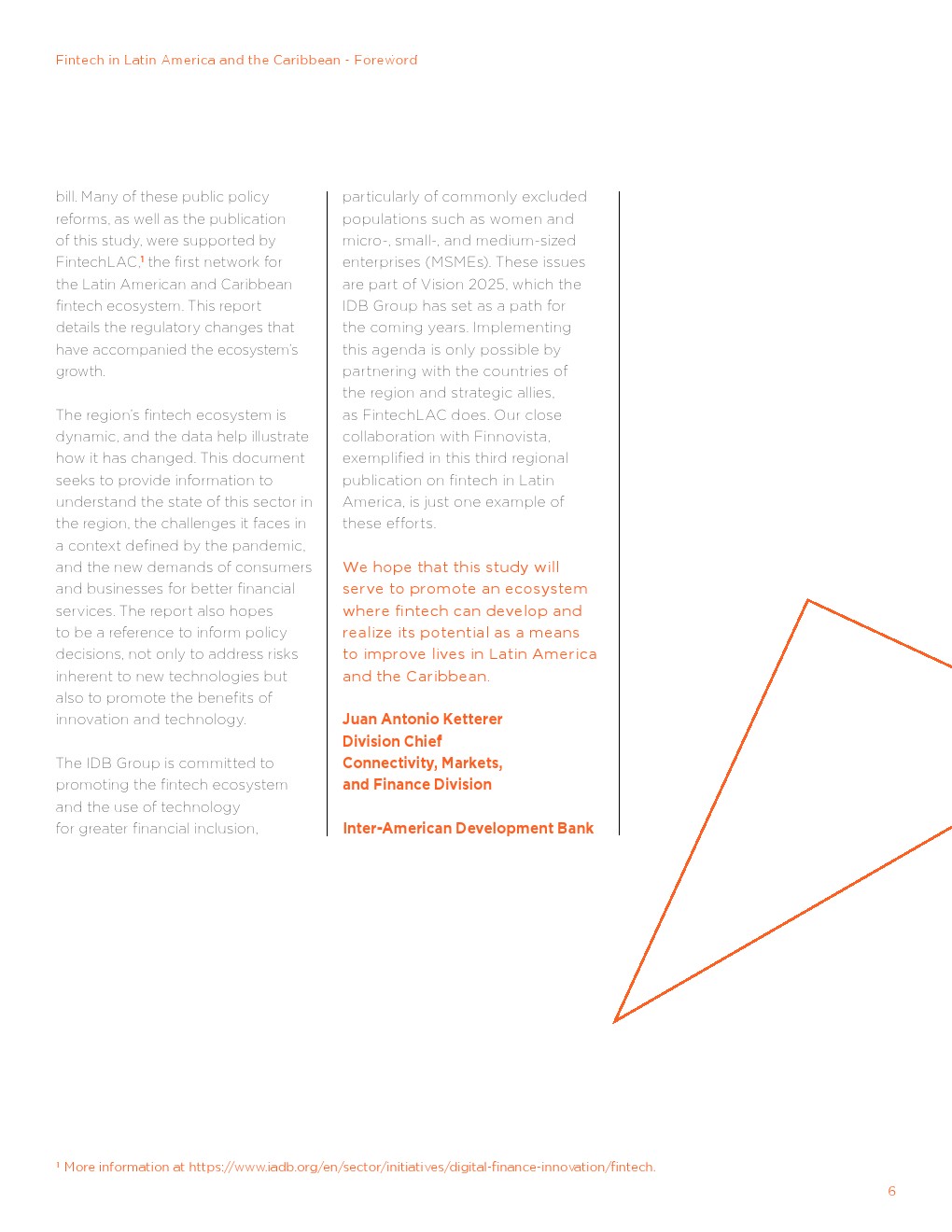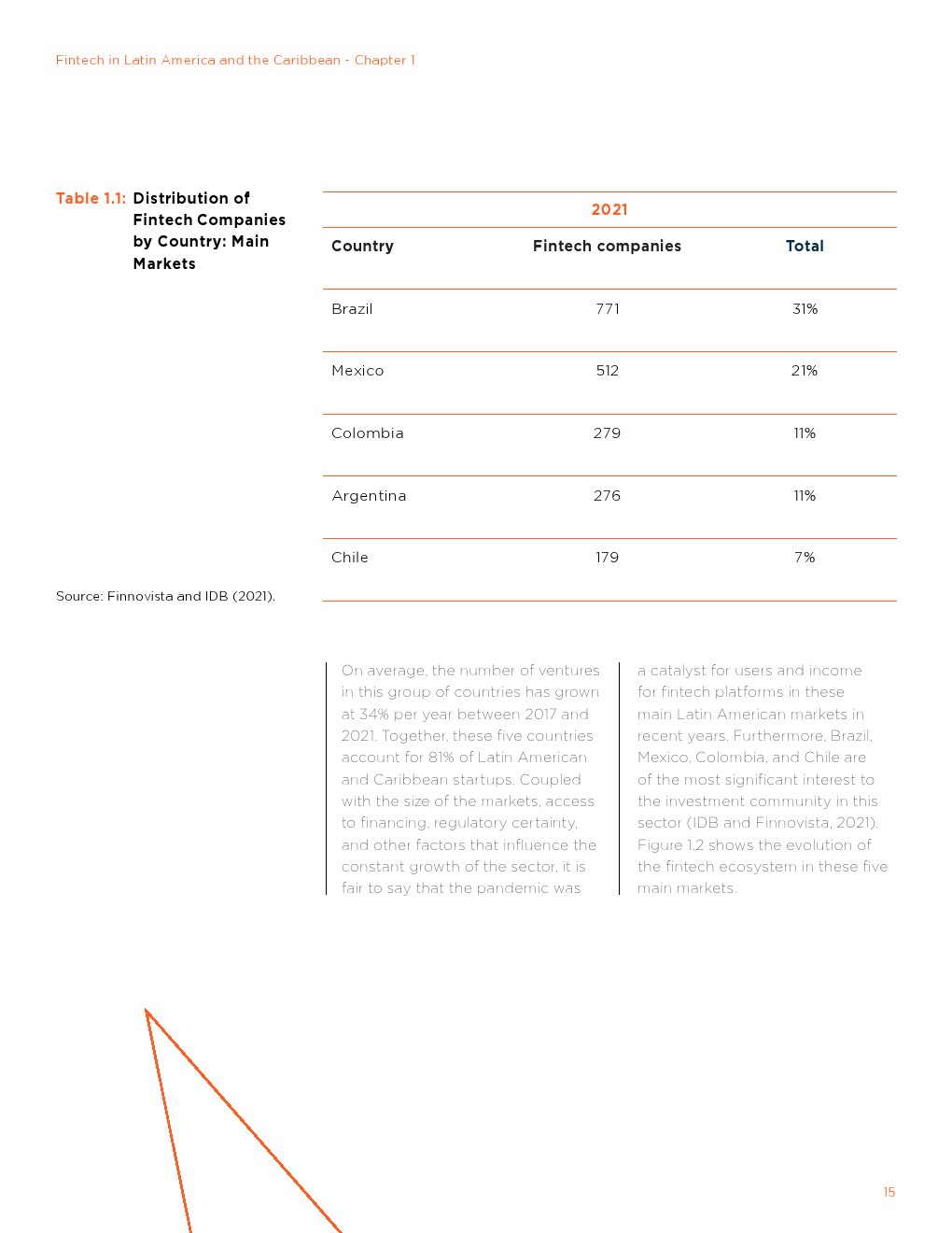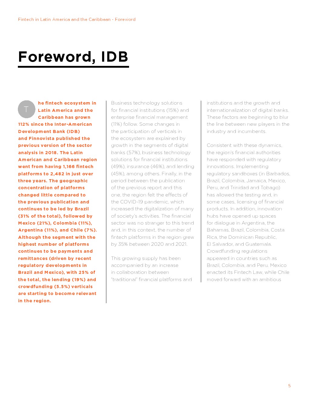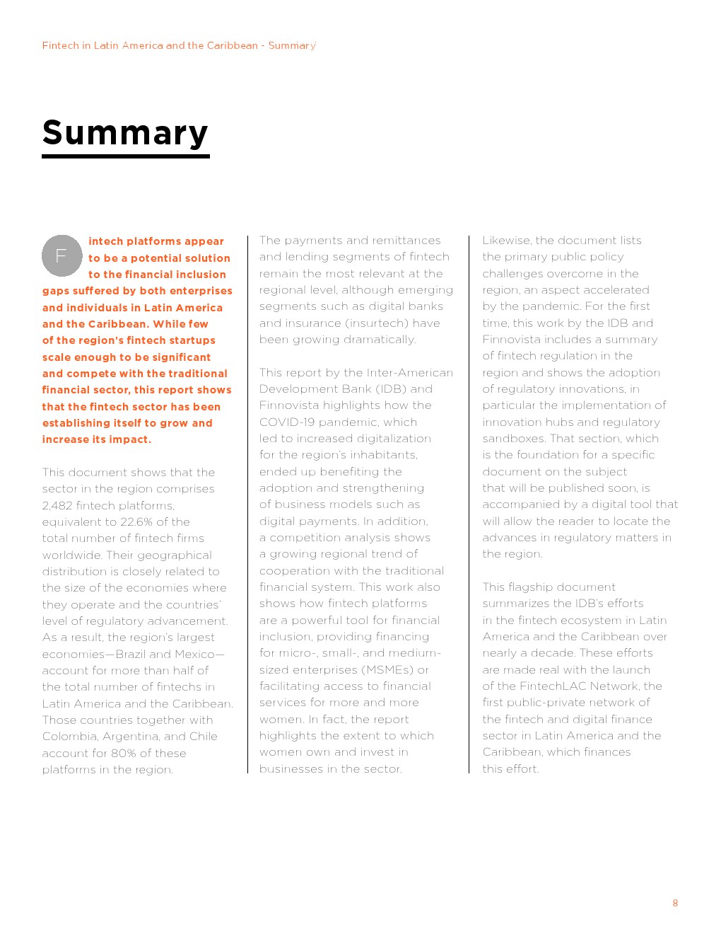 泛美开发银行(IDB)和 Finnovista 的这份报告强调了新冠大流行提高了该地区居民数字化程度,并最终有利于数字支付等商业模式的普及。此外,竞争分析显示,与传统金融体系合作的区域趋势正在加强。报告还展示了金融科技平台如何成为金融包容性的强大工具,为中小微企业(MSME)提供融资或促进越来越多的女性获得金融服务。事实上,该报告强调了女性获得该行业支持的程度。