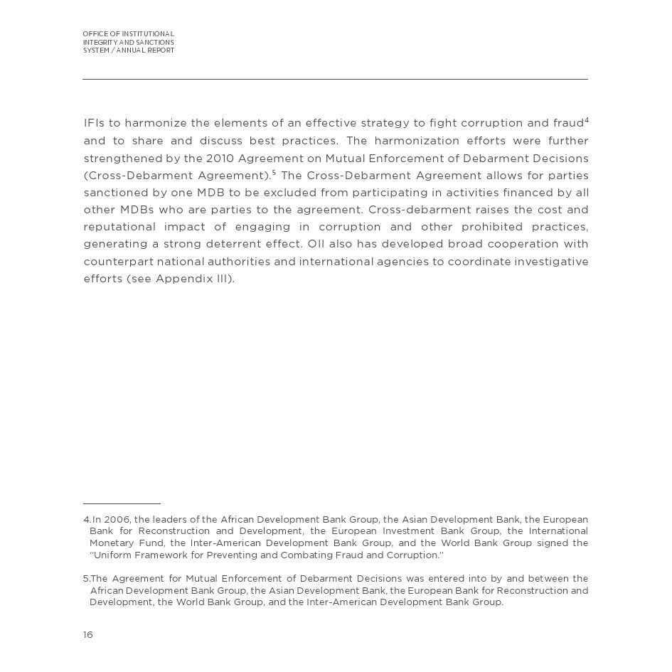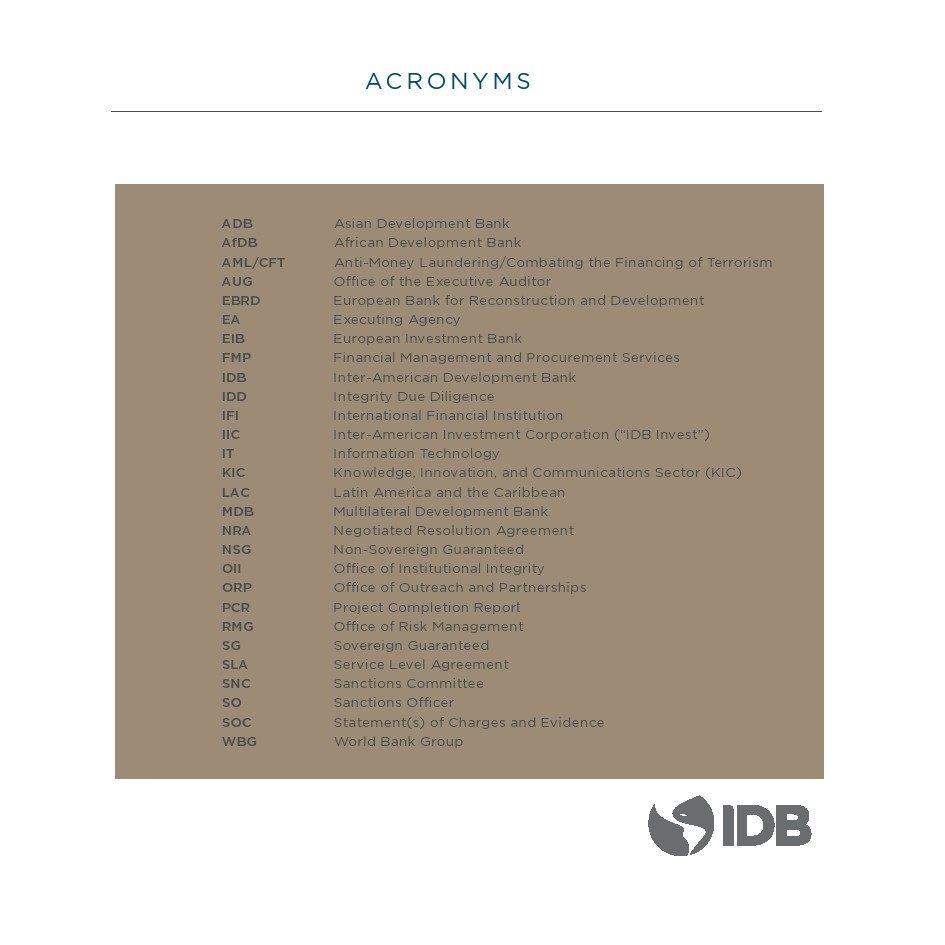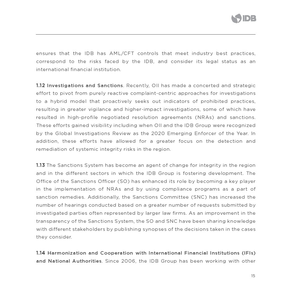 处理欺诈和腐败指控的独立系统。系统框架还认识到需要建立一种机制来处理 IDB 集团资助活动中的欺诈和腐败指控。 2003 年,OII 成立,负责接收和调查此类指控。随后,IDB 集团于 2011 年创建了由制裁官员和制裁委员会组成的现行制裁系统,以裁决 OII 调查产生的案件。