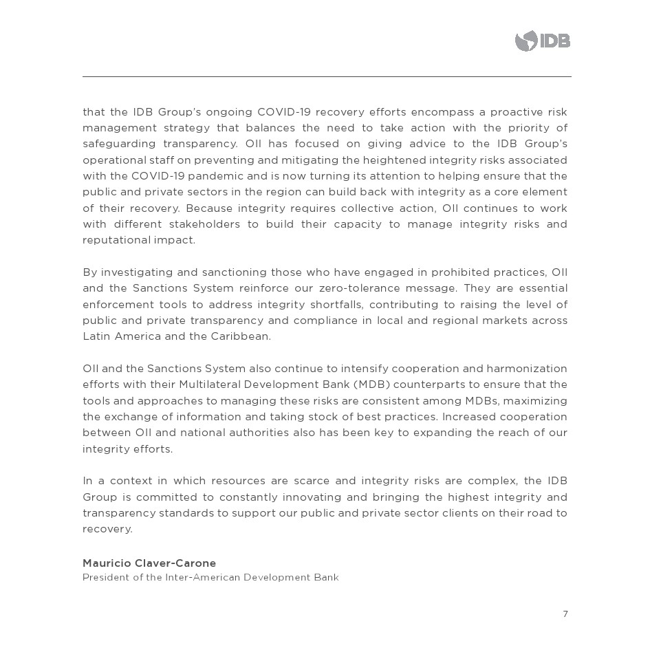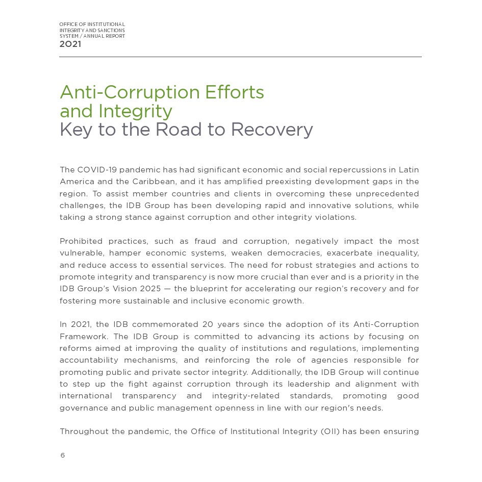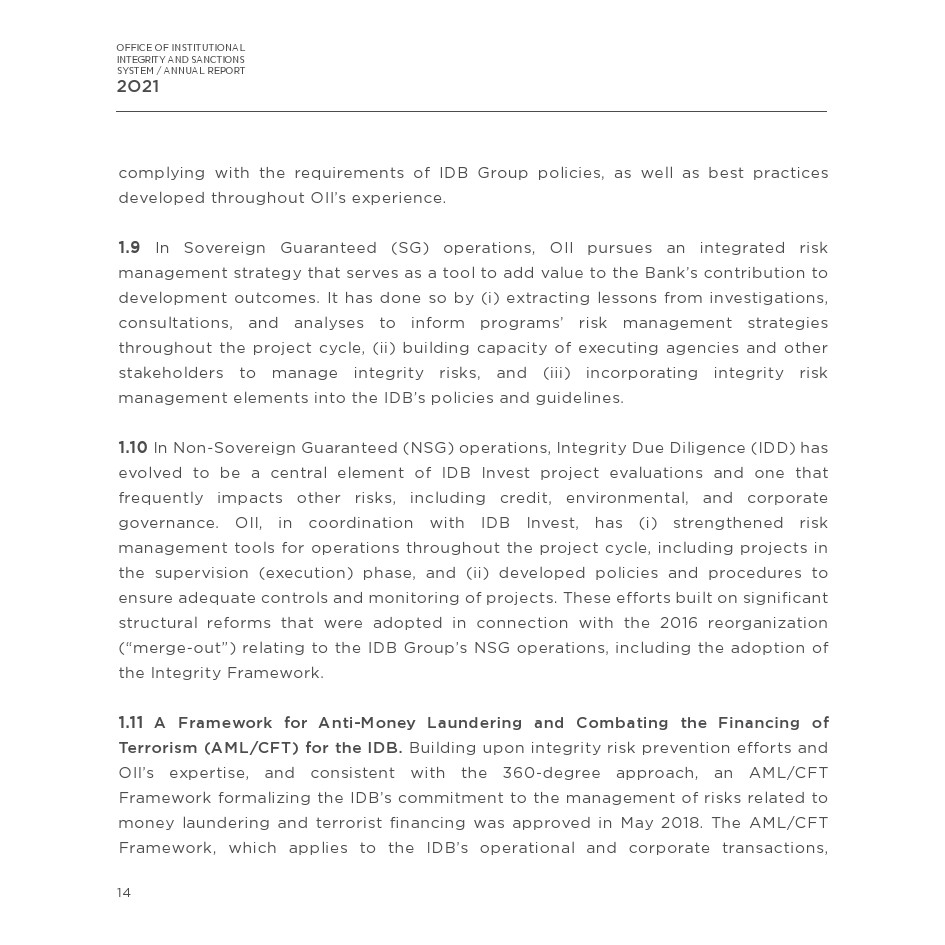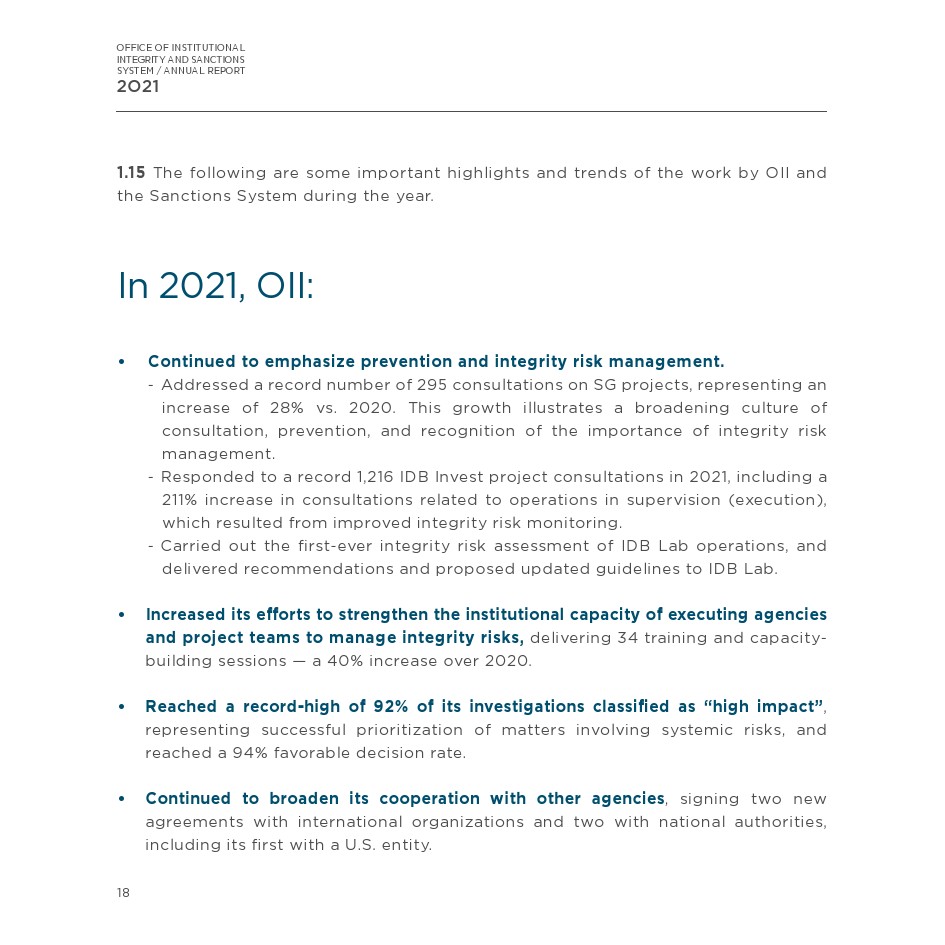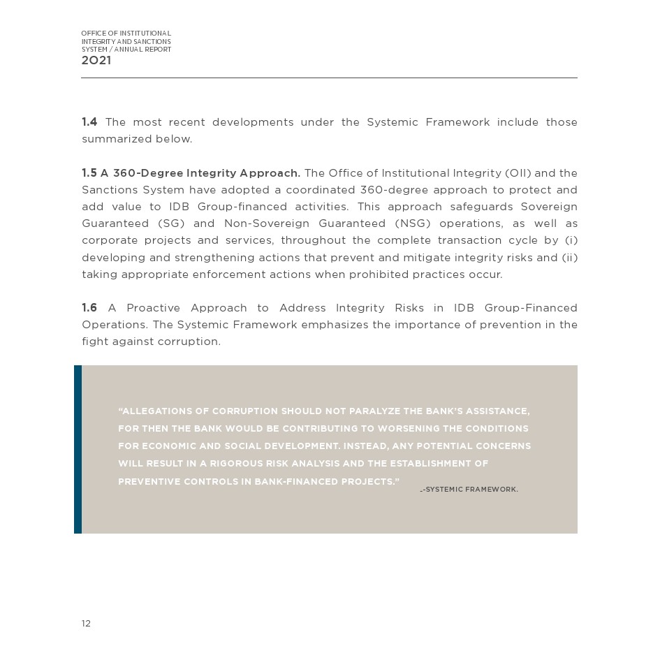 泛美开发银行(IDB)发布了“2021年机构诚信和制裁系统年度报告”。2021年是机构诚信和制裁系统办公室 (OII)的反腐败框架获得董事会批准的 20 周年,即“加强泛美开发银行反腐败系统框架”,简称“系统框架”。系统框架强调需要在运营的设计和执行中考虑完整性,并认识到建立机制来处理 IDB 资助活动中的欺诈和腐败指控的重要性。