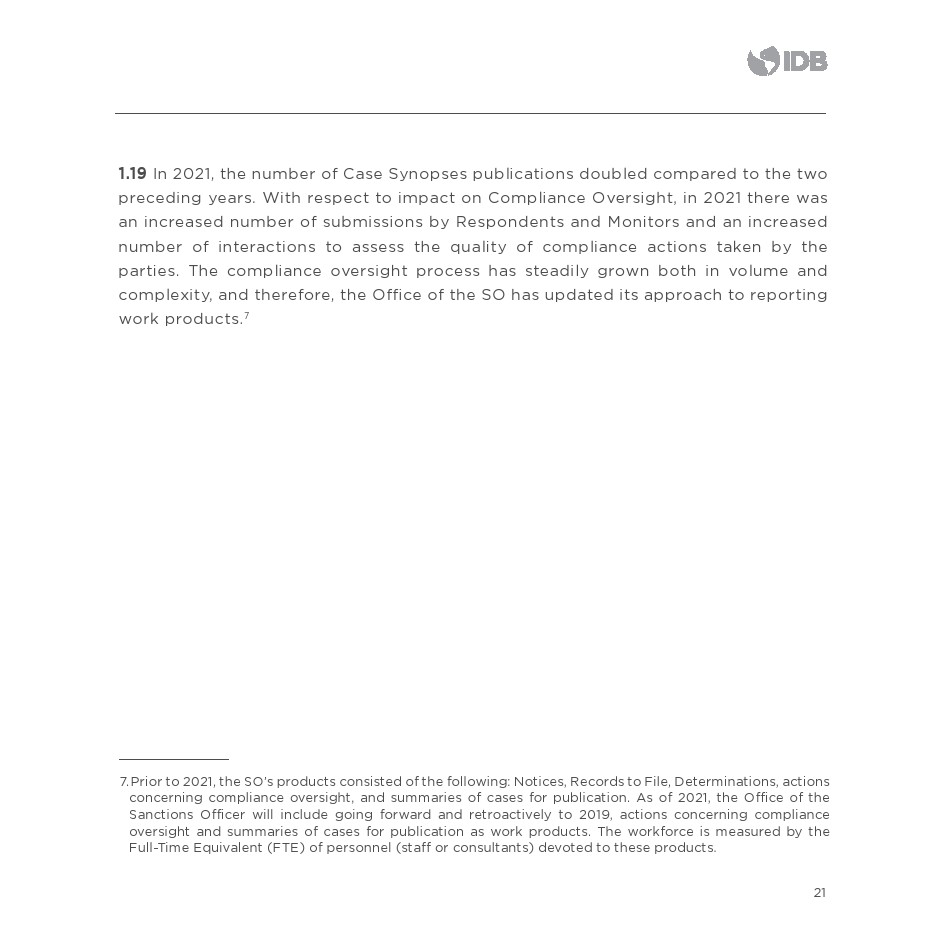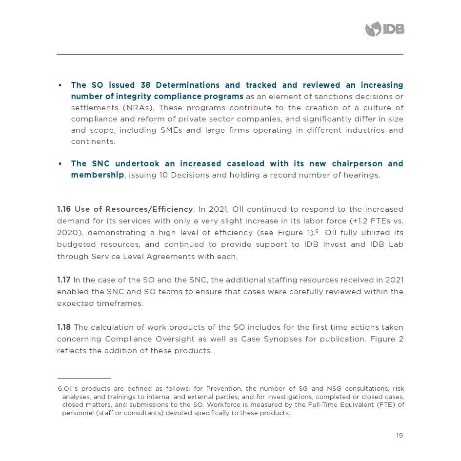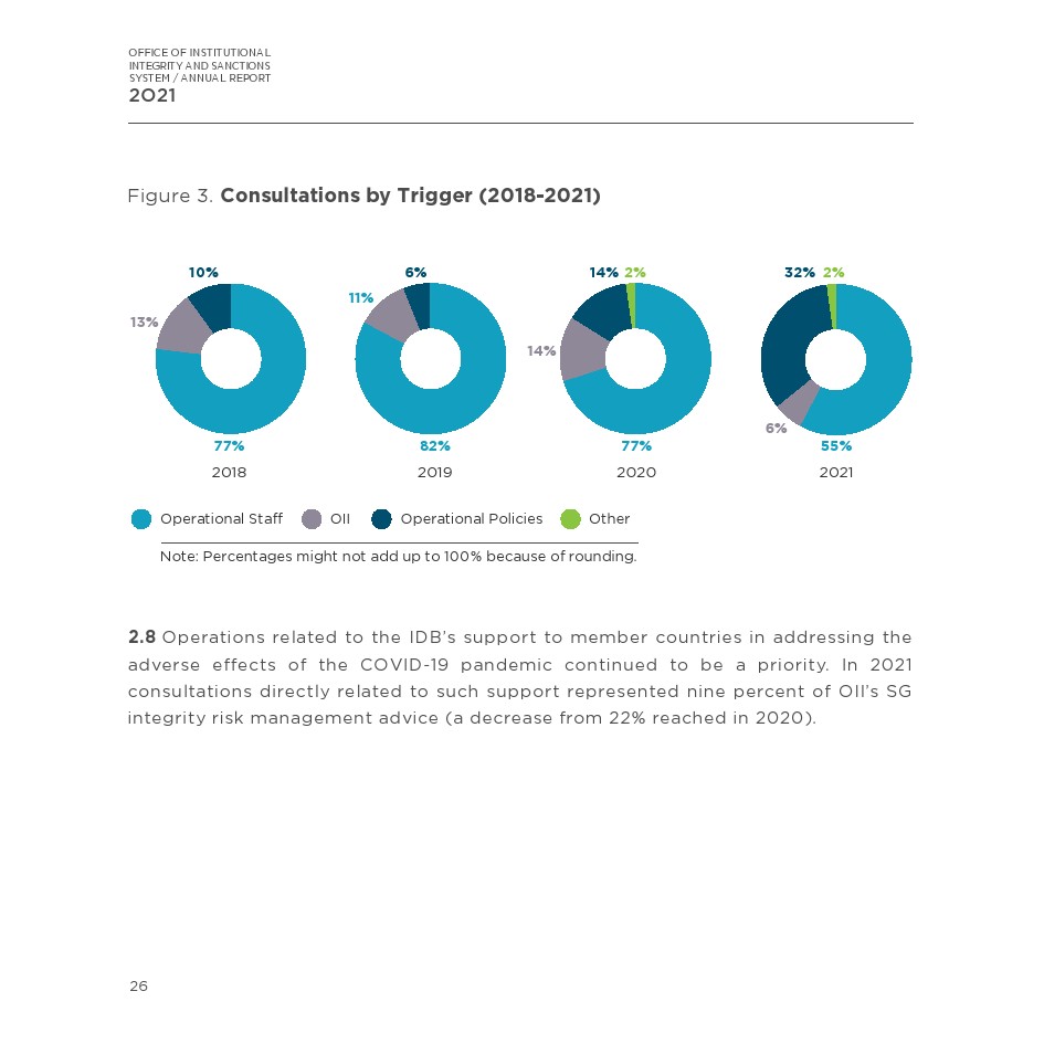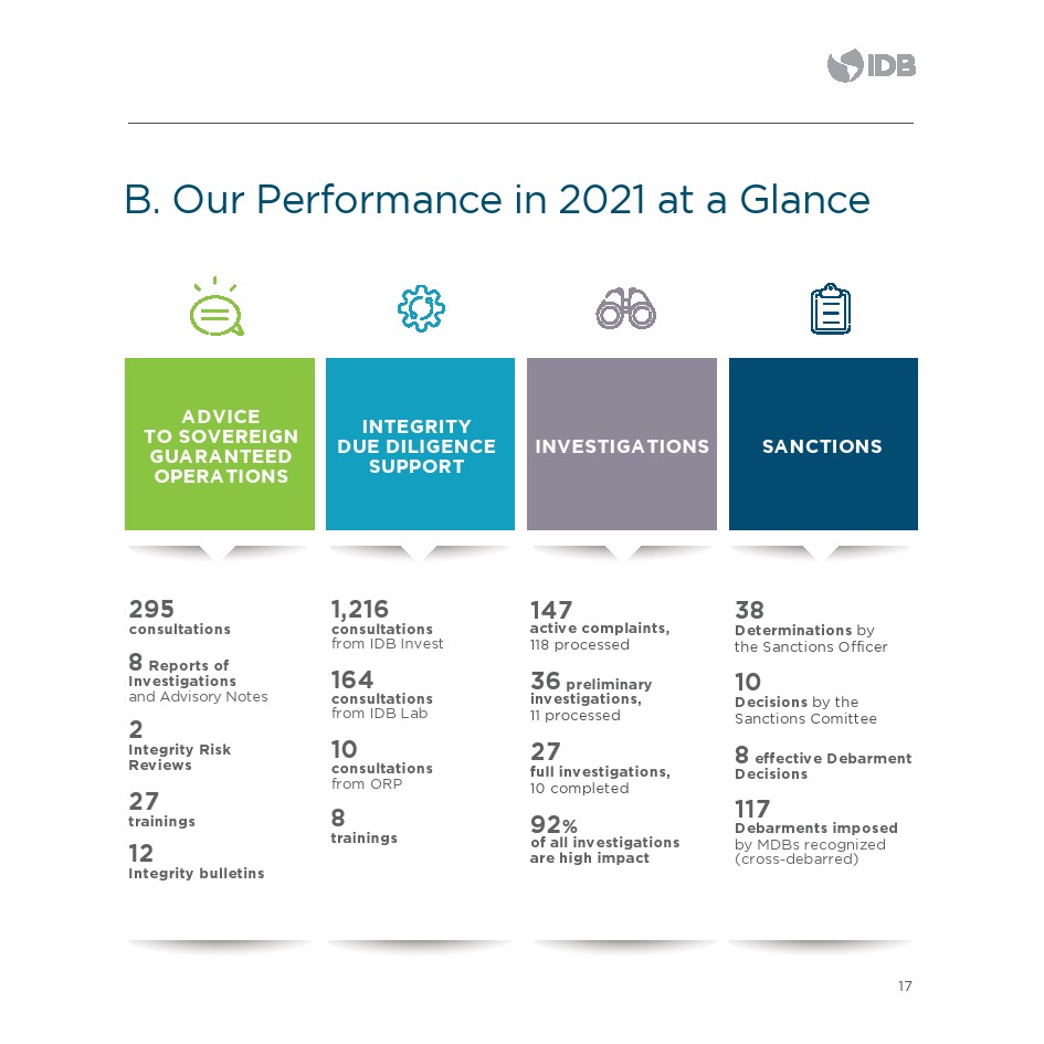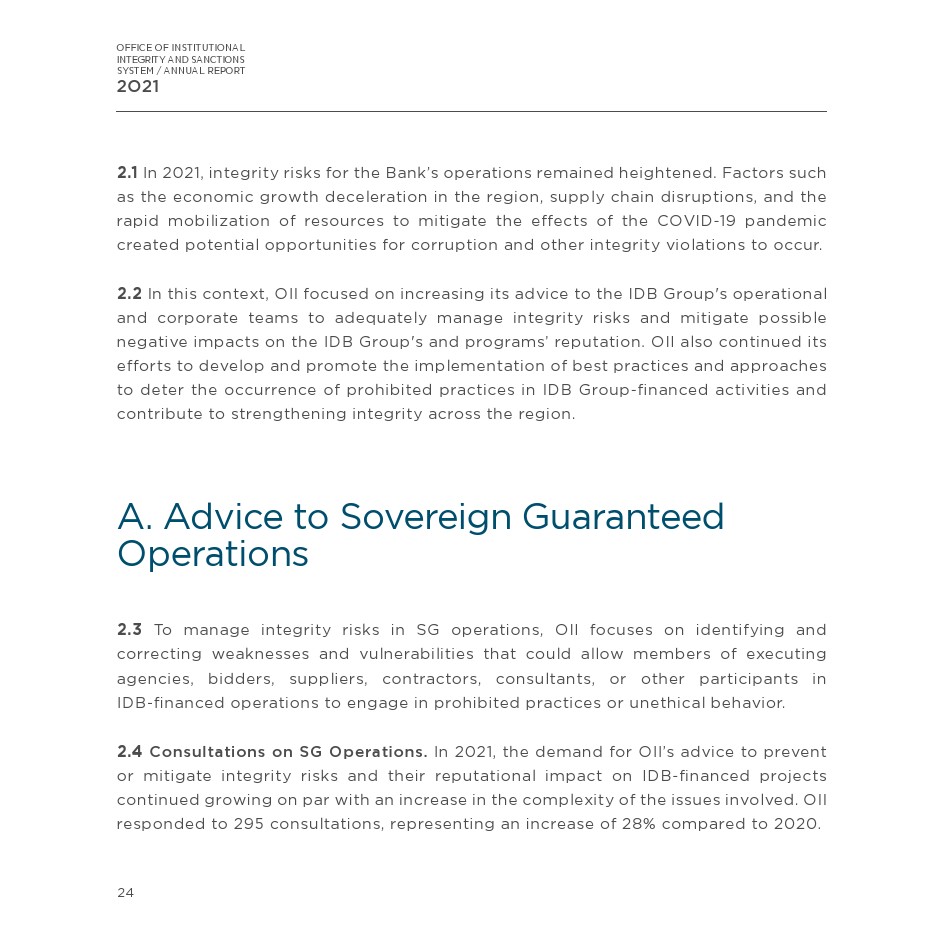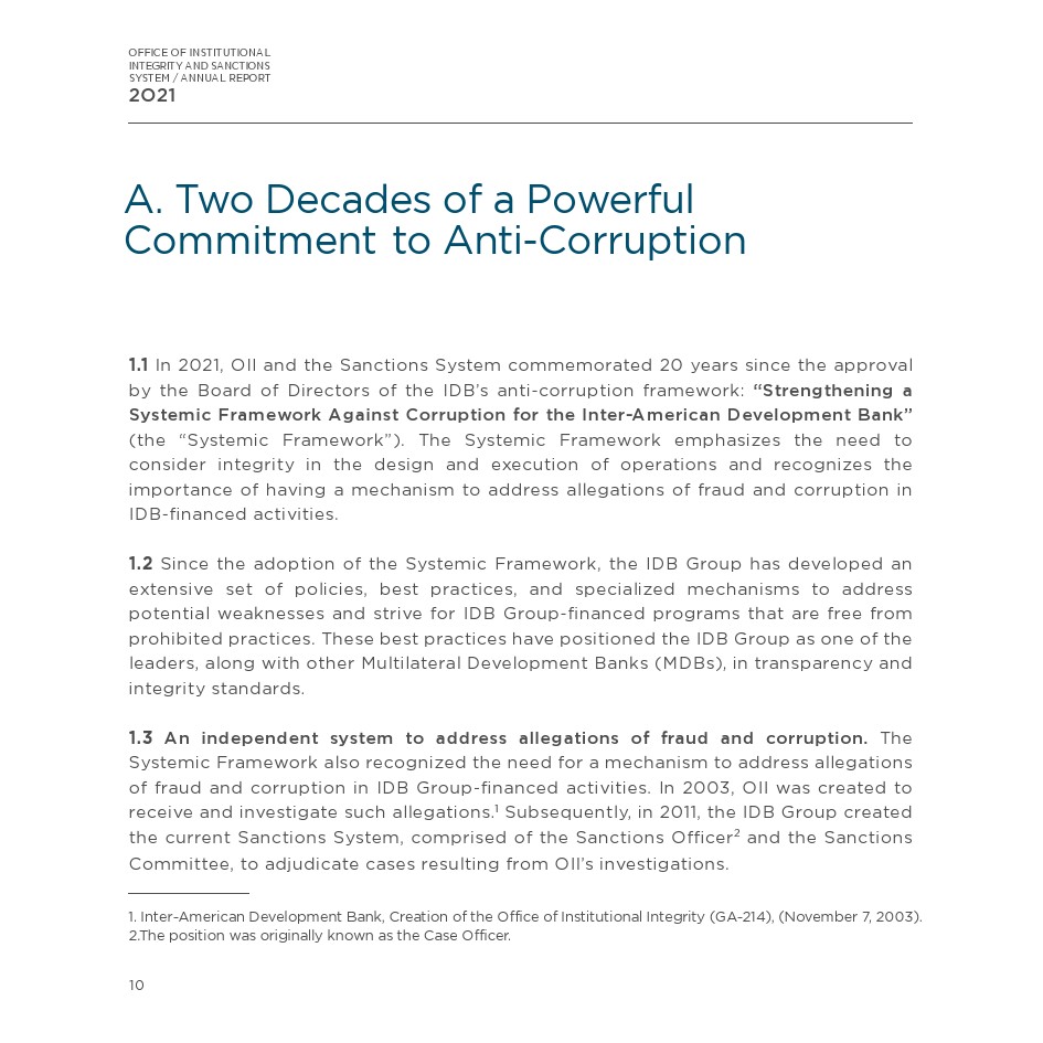 泛美开发银行(IDB)发布了“2021年机构诚信和制裁系统年度报告”。2021年是机构诚信和制裁系统办公室 (OII)的反腐败框架获得董事会批准的 20 周年,即“加强泛美开发银行反腐败系统框架”,简称“系统框架”。系统框架强调需要在运营的设计和执行中考虑完整性,并认识到建立机制来处理 IDB 资助活动中的欺诈和腐败指控的重要性。