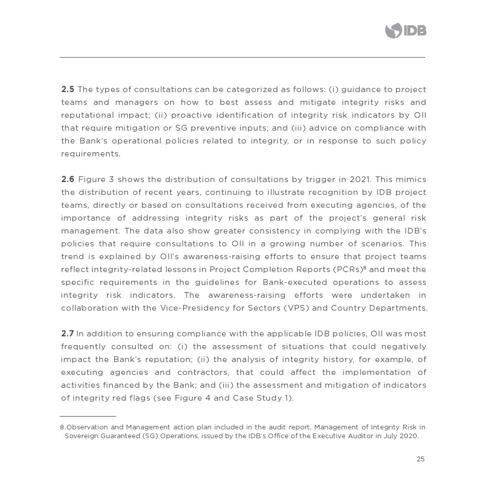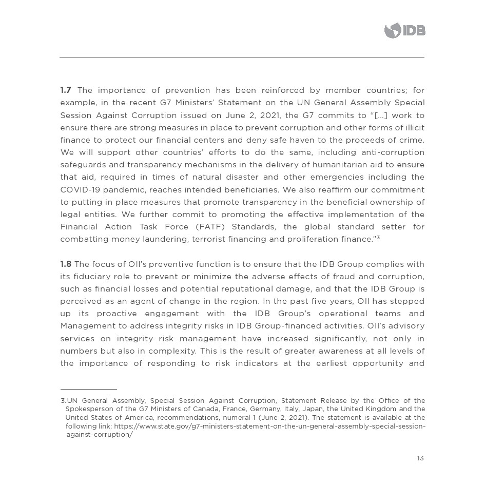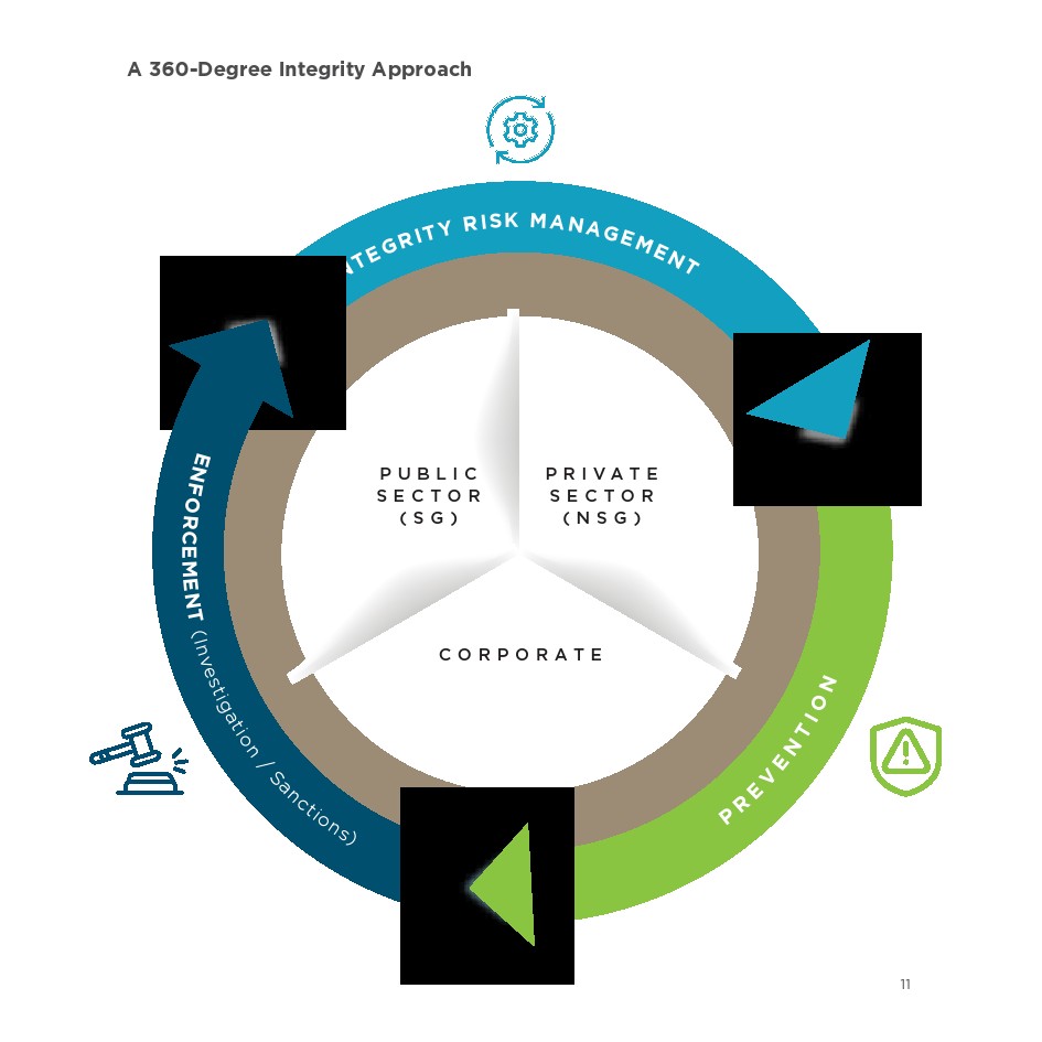 360 度完整性方法。OII和制裁系统采用协调一致的 360 度方法来保护 IDB 集团资助的活动并为其增值。这种方法通过制定和加强预防和减轻诚信风险的措施,以及在发生违禁行为时采取适当的执法行动。