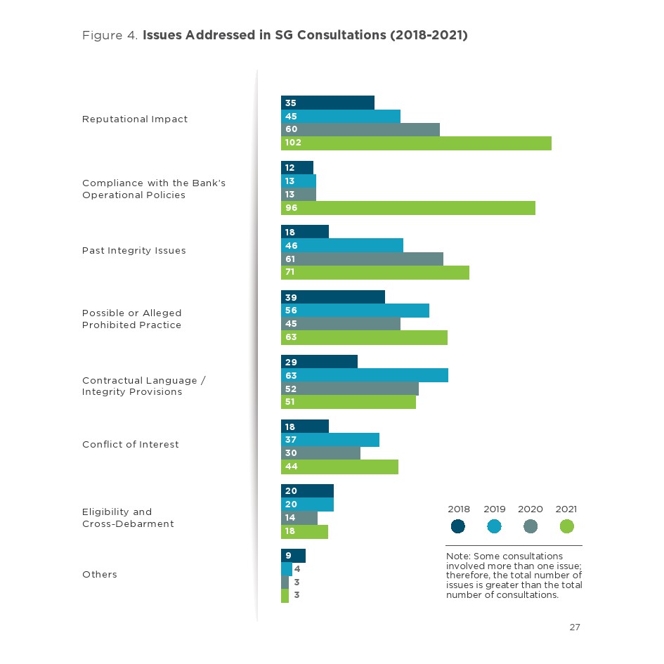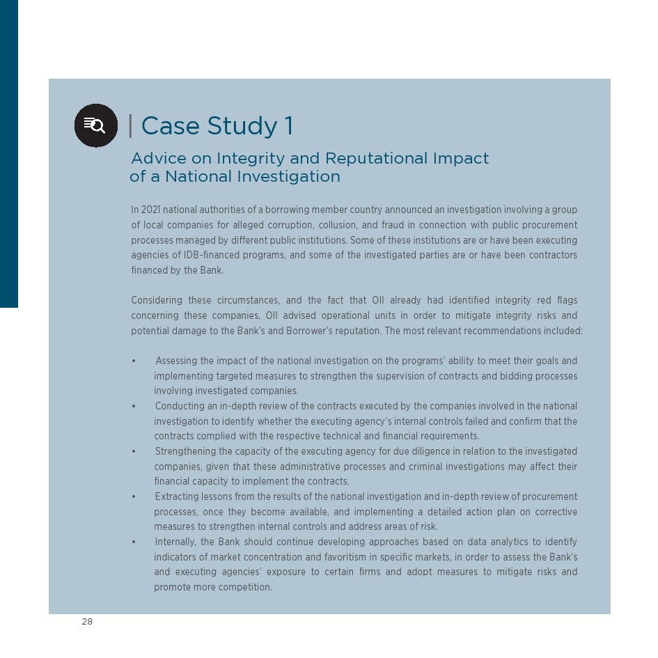 自采用系统框架以来,IDB 集团制定了一套广泛的政策、最佳实践和专门机制,以解决潜在的弱点,并争取 IDB 集团资助的项目没有违规的做法。这些最佳实践使 IDB 集团与其他多边开发银行相比在透明度和完整性标准方面处于领先地位。