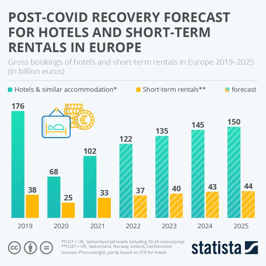 新冠疫情后的酒店业,复苏之路有多长? 2019年,欧洲酒店预订总额超过1760亿欧元,到2020年下降了一半多,仅为680亿欧元。同期,短期租赁预订量下降了130亿英镑。然而,短期租赁预订预计将在2022/2023年完全恢复。对于酒店和类似住宿,复苏之路可能要长得多,即使到2025年,预计预订量也不会恢复到疫情前的水平。 更多阅读:迈点研究院:2023年4月中国酒店业发展报告澎润:2021中国酒店业品牌战略管理报告如果没有价格一致性—酒店业将受到什么影响?TripAdvisor:2012年酒店行业预期和计划eMarketer:数字旅行者通过元搜索网站查找酒店房间TravelClick:2012年北美酒店业将呈现增长态势Sojern:2017年酒店业营销指南olery:评论有多重要,酒店行业评论的赤裸真相2014年酒店业消费者需求研究MTA:2015年6月中国酒店业全服务中档品牌发展STR:2024年美国酒店业最终预测Oracle Hospitality:2025酒店业报告MTA:2015年8月中国酒店业精品品牌发展报告酒店业大数据探讨2015年4月中国酒店业移动互联网运营数据分析
