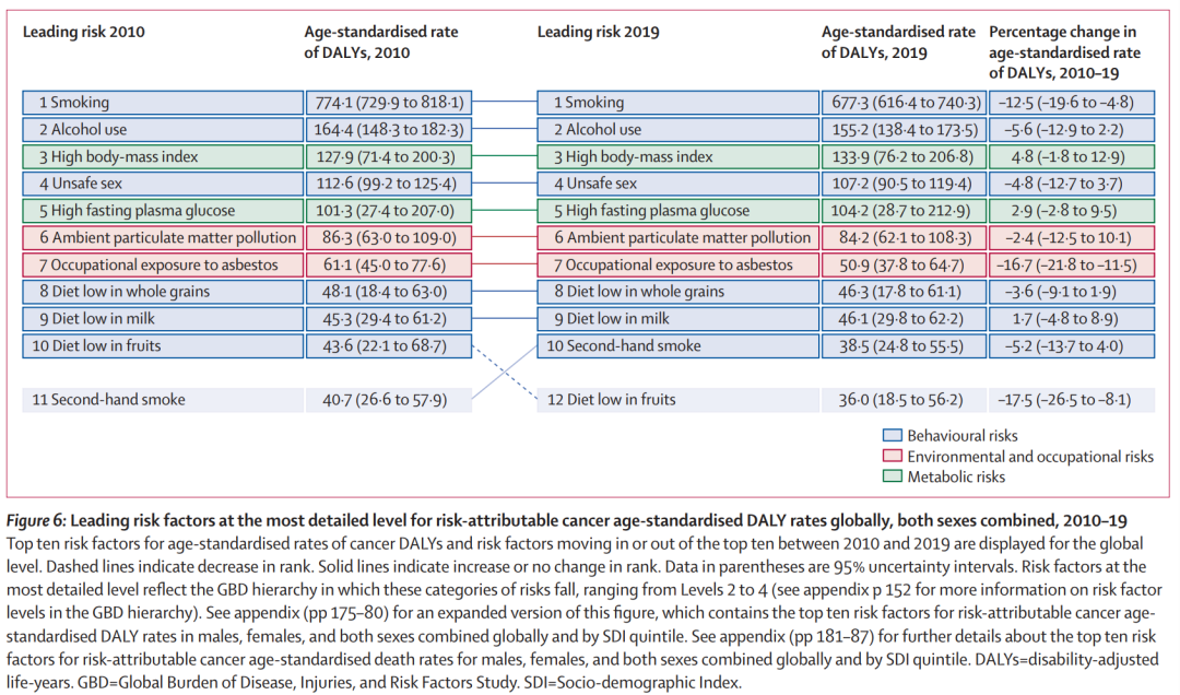 女性排名第一的风险因素也是吸烟,占2019年全球归因于风险因素的女性癌症DALYs总数的10.7%(9.9–11.5)。排名第二的是不安全性行为,占比为8.2%(7.0-8.8);其次是饮食风险(5.1%,95% UI 4.0-6.7)、高BMI(4.7%,95% UI 2.8-7.0)和高空腹血糖(3.6%,95% UI 1.0-7.5)。