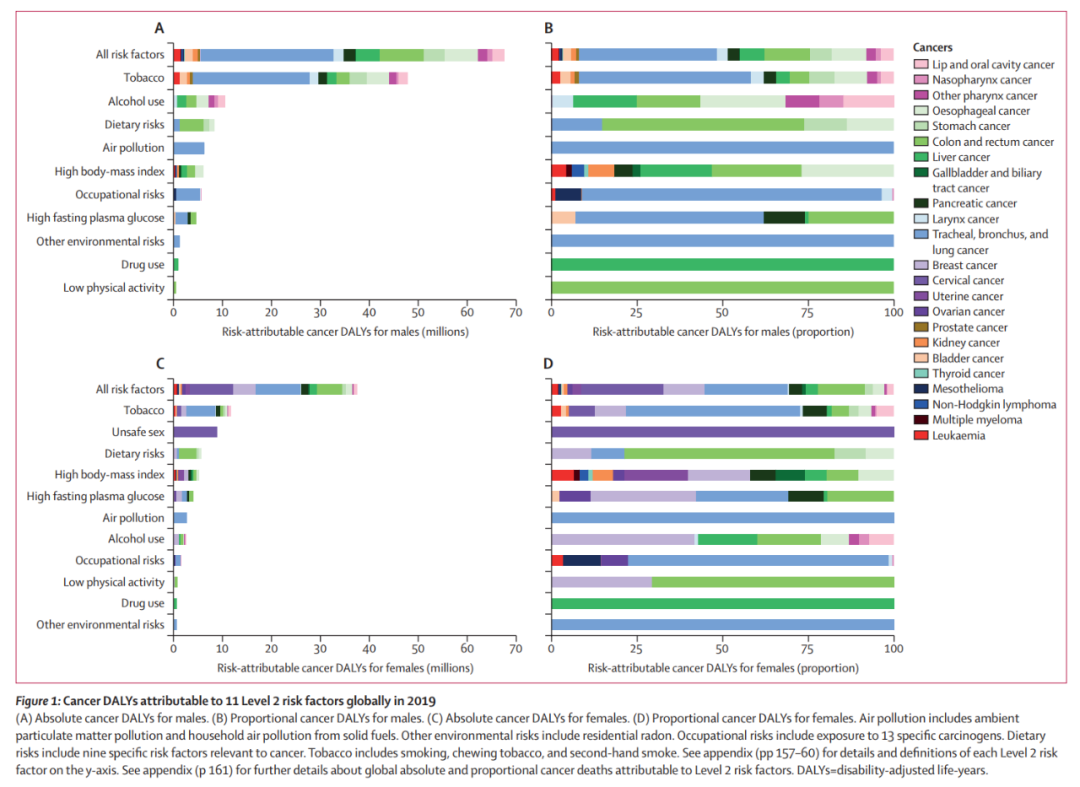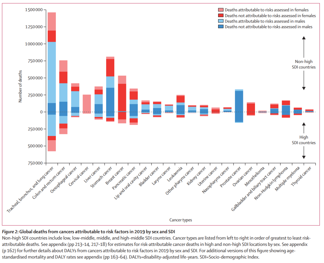 在全球归因于风险因素的癌症死亡病例中,总体占比最多的是肺癌(含肺、气管和支气管,共36.9%),其次是结肠癌和直肠癌(13.3%)、食管癌(9.7%),及胃癌(6.6%);在女性中占比较高的是宫颈癌(17.9%)、结肠癌和直肠癌(15.8%)以及乳腺癌(11.0%)。