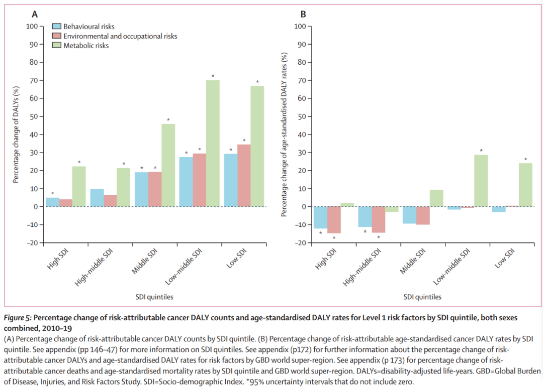 当排除性别相关癌症时(如宫颈癌),归因于致癌风险因素的癌症死亡男性远多于女性;但高SDI国家的这一男女比例却往往小于低SDI国家。此外,虽然高SDI国家人口数量仅占全球的13.1%,但这些国家在全球癌症死亡总数中占比却达25.4%,在归因于致癌风险因素的癌症死亡人数中占比达26.5%。