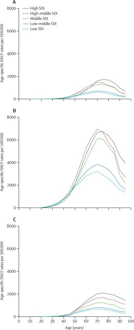 部分研究结果用社会人口指数(socio-demographic index, SDI)表示,SDI是根据25岁以下妇女的总生育率、人均可支配收入和15岁及以上个人平均受教育水平计算得出的综合指数。该指数的范围从0(低SDI)到100(高SDI),其五分位区间分别用于代表低、低-中、中、中-高、高SDI国家。