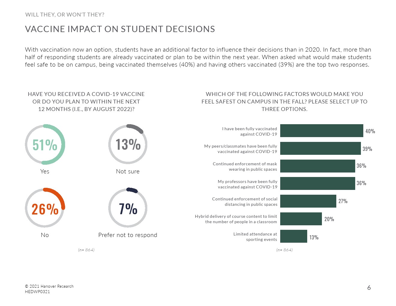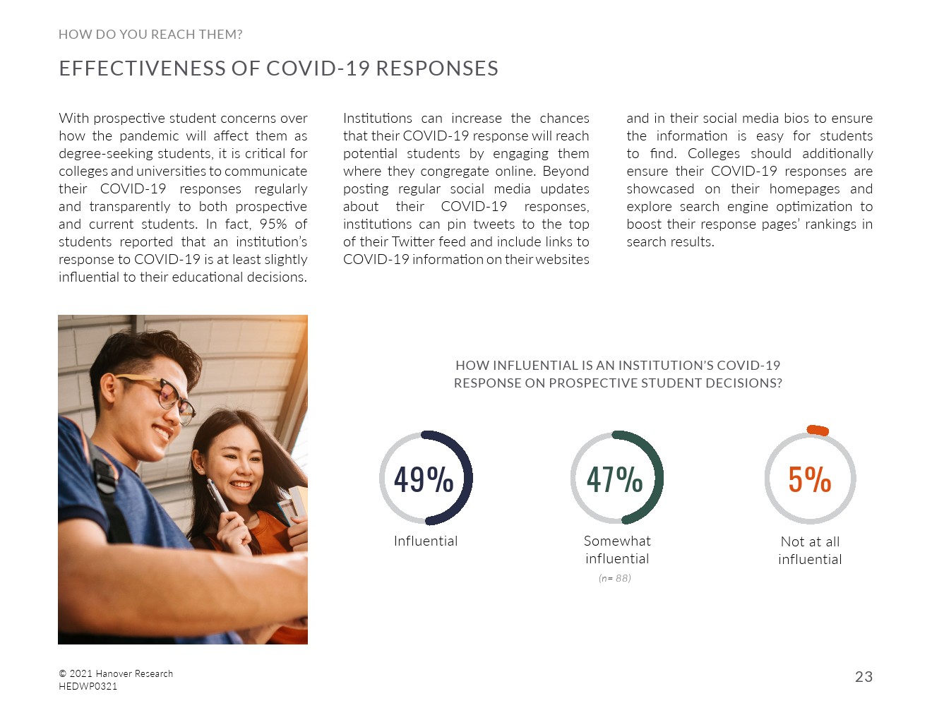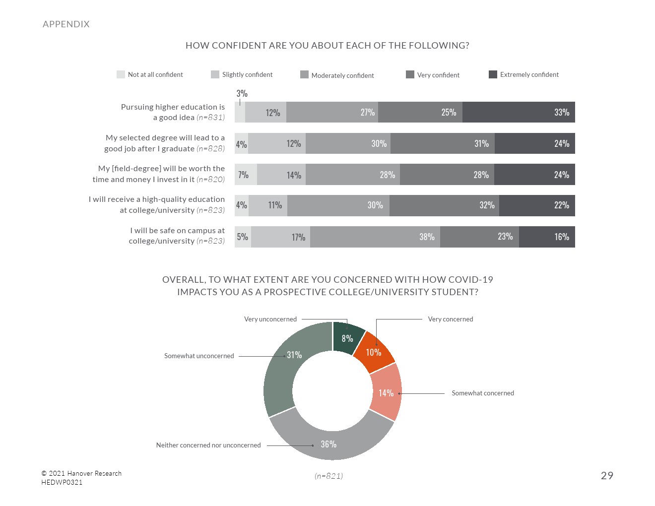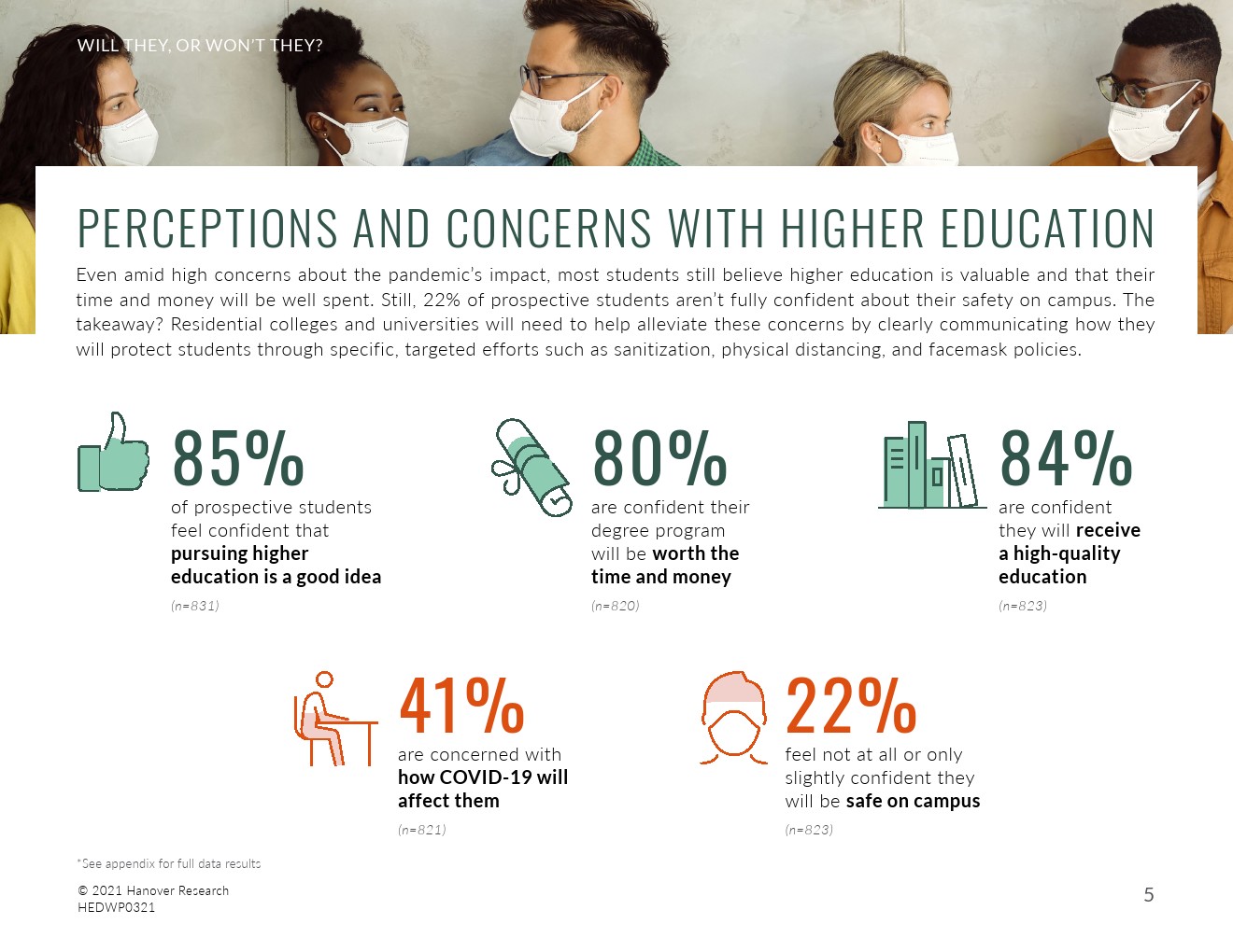 即使在对大流行的影响高度担忧的情况下,大多数学生仍然认为高等教育是有价值的,他们的时间和金钱会得到很好的利用。尽管如此,仍有 22% 的准学生对自己在校园内的安全没有完全信心。住宿学院和大学需要通过明确传达他们如何通过特定的、有针对性的努力来保护学生来缓解这些担忧。