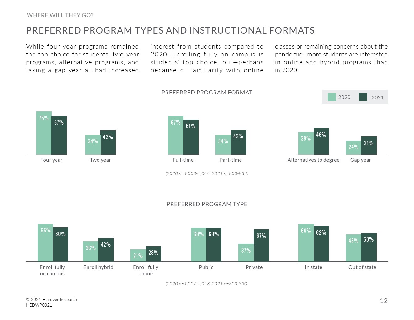 虽然四年制课程仍然是学生的首选,但与 2020 年相比,学生对两年制课程、替代课程的兴趣都有所提高。在校园内全面注册是学生的首选,但是因为对在线课程的熟悉程度或对大流行的担忧,更多学生对在线和混合课程感兴趣。