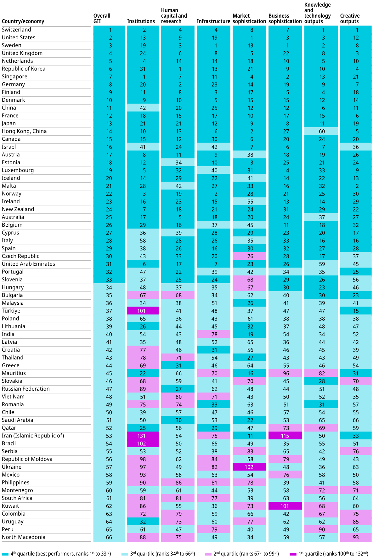 报告从创新投入和创新产出两个方面,设置了政策环境、人力资本与研究、基础设施、市场成熟度、商业成熟度、知识与技术产出、创意产出等7个大类81项细分指标,对全球132个经济体的创新生态系统表现进行综合评价排名。