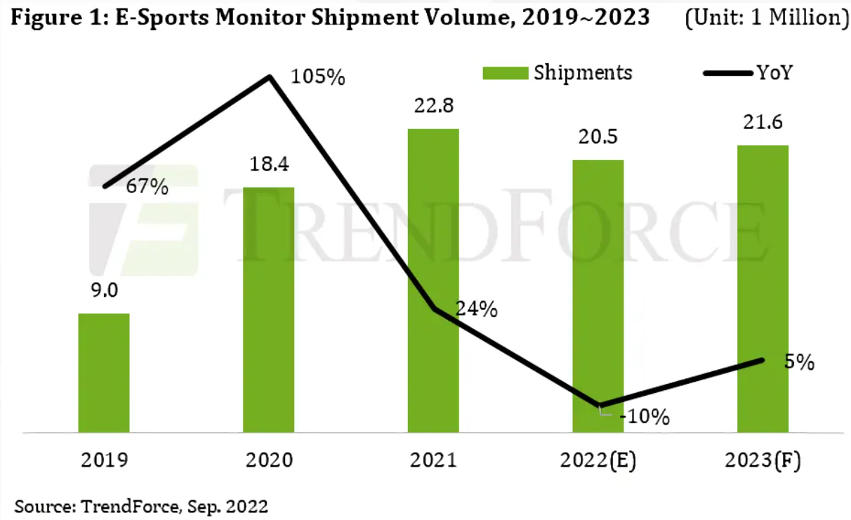 根据 TrendForce 发布的最新报告,全球游戏显示器市场虽然涌现了大量创意新品和种类繁多的附加功能,但是 2022 年出货量预估会下降 10%。报告中指出,2021 年游戏显示器的出货量为 2280 万台,不过在 2022 年这个数字会下降到 2050 万台。