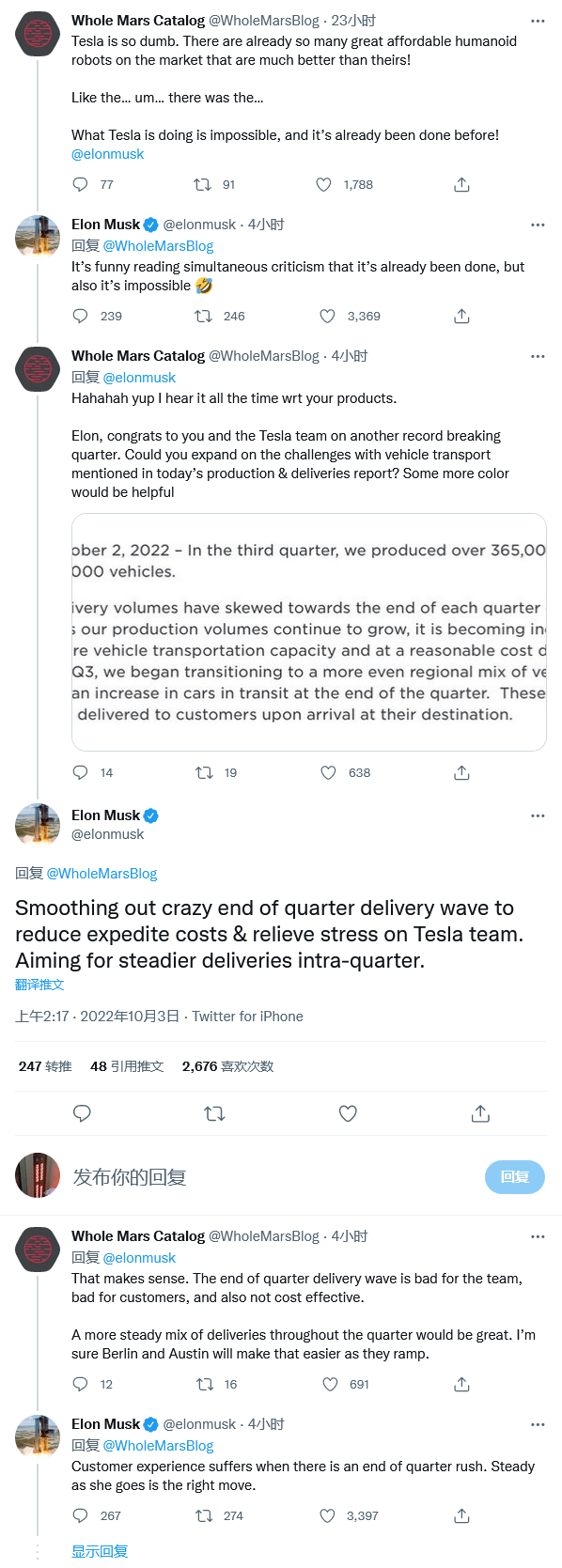 马斯克在推文中表示:“拉平季度末疯狂的抓产量曲线,以降低加速成本并减轻特斯拉团队的压力。旨在实现季度内更稳定的交付。当季末高峰期结束时,客户体验会受到影响。一路走稳才是正确之举”。