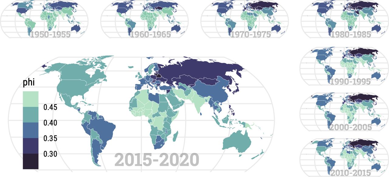 他们还使用了《2019年世界人口前景》中的简略生命表。这提供了199个国家从1950-54年到2015-19年按5岁年龄组和5岁时期的特定性别的生命表。最后,他们利用美国全国的死亡和人口统计数字,按教育水平和婚姻状况比较了男性比女性长寿的概率。