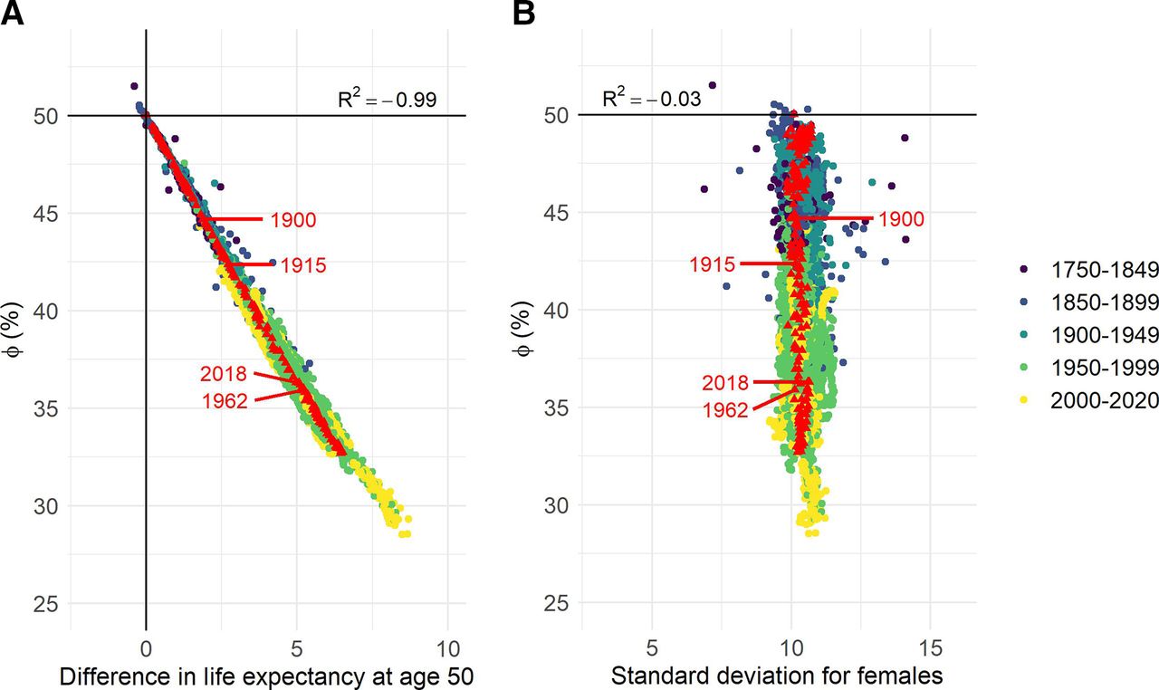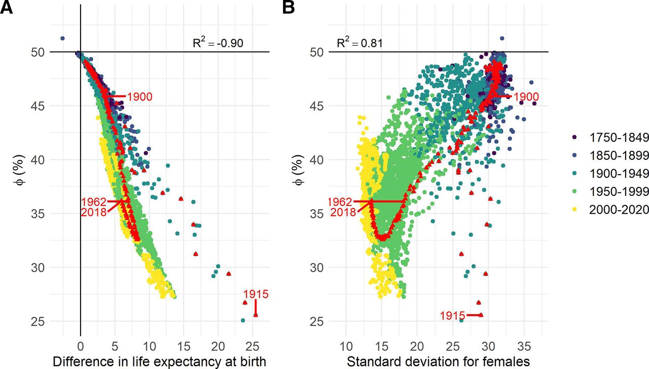 数据分析显示,自1850年以来,在所有时间点和所有人口中,男性比女性长寿的概率都在25%至50%之间,只有少数国家在不同时期的数值高于50%。