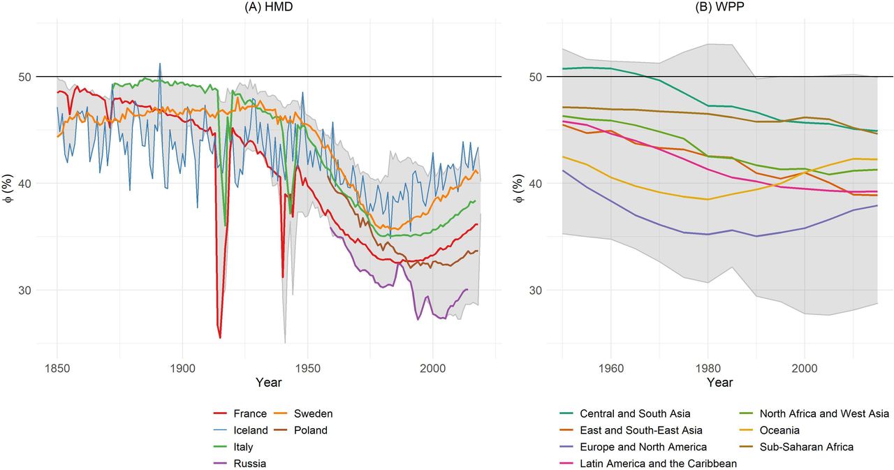 研究人员利用了人类死亡率数据库中41个国家按性别和个别年份划分的生命表,加上东德和西德以及英国4个国家的单独数据。