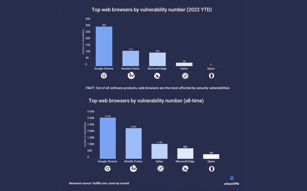 接下来是 Safari,它具有一些最低级别的漏洞。例如,在 2022 年前三季度,它有 26 个漏洞,自发布以来累积漏洞数为 1,139 个。同时,截至 2022 年,Opera 浏览器没有记录在案的漏洞,总共只有 344 个漏洞。