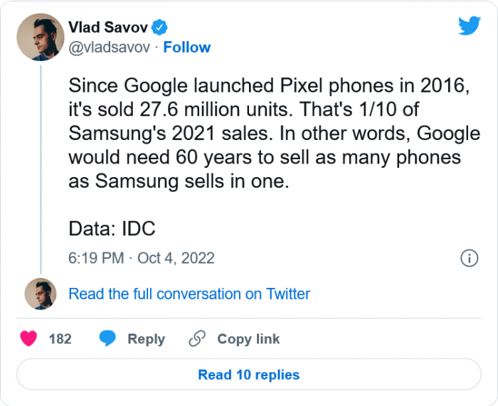 根据IDC分享的数据,自2016年以来,Google只成功售出2760万部Pixel手机。这相当于2021年三星销量的1/10。通过计算,你会发现,Google需要60年才能卖出三星一年的手机数量,这是一个疯狂的差异,让人怀疑Google在哪里出了问题。