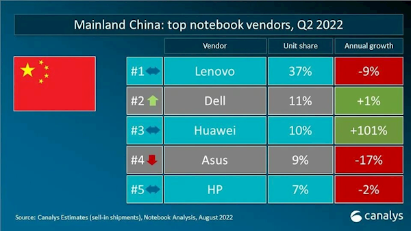 日前,市场调研机构Canalys发布最新报告,显示2022年第二季度华为笔记本一枝独秀,成为中国大陆市场的一匹黑马。在中国大陆市场,前五位分别为联想(37%)、戴尔(11%)、华为(10%)、华硕(9%)、惠普(7%)。