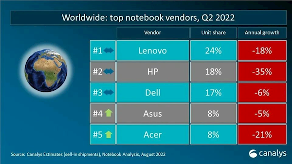 2022年第二季度全球笔记本电脑出货量前五位分别为联想(24%)、惠普(18%)、戴尔(17%)、华硕(8%)、宏碁(8%)。