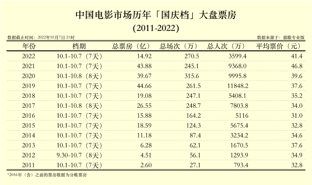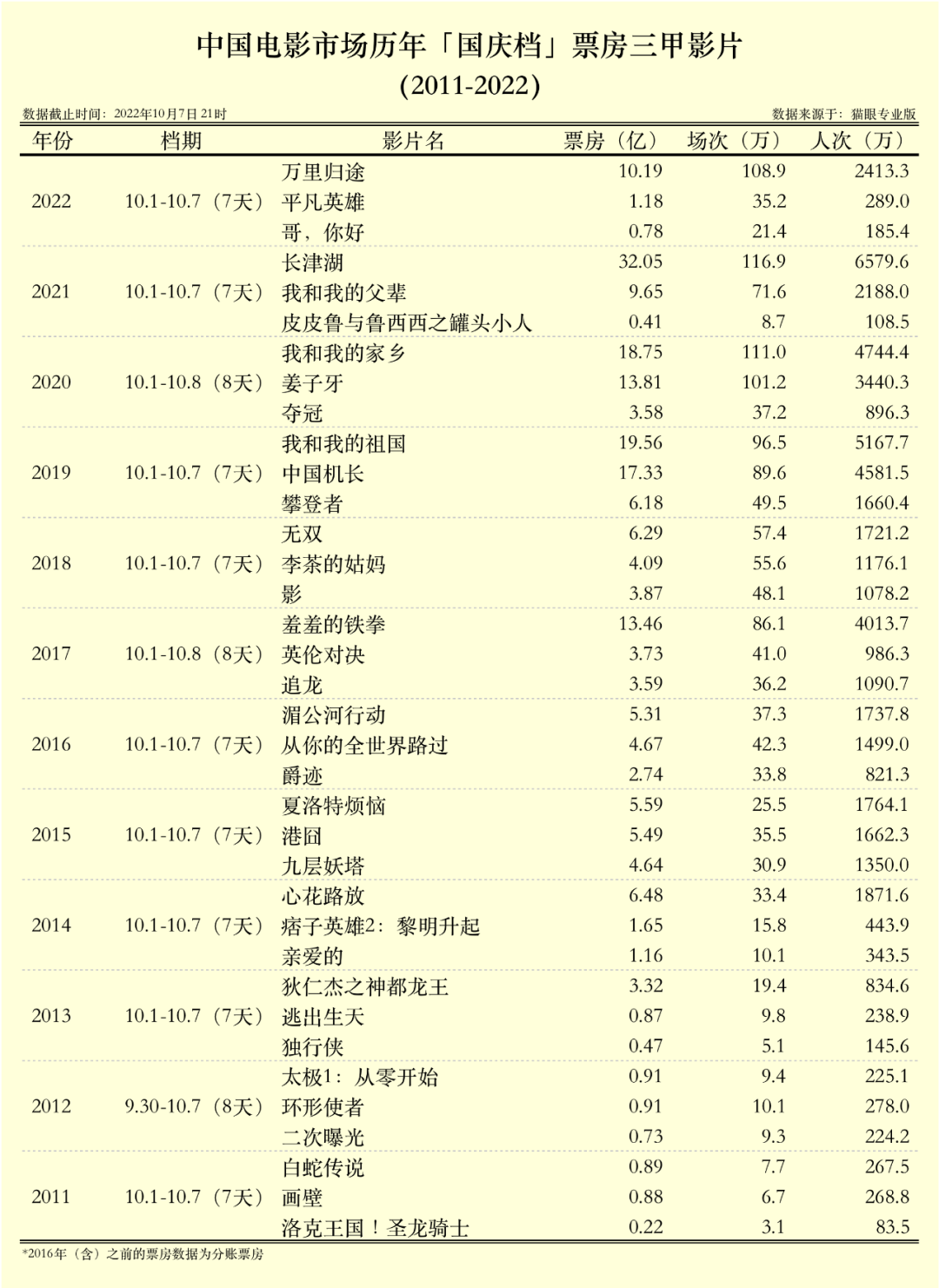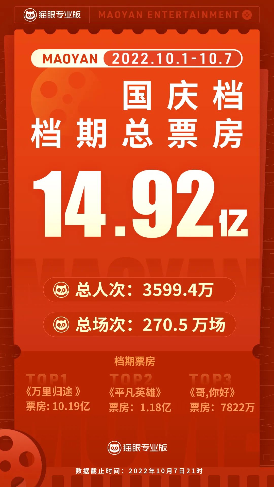 猫眼研究院:2022国庆档总票房14.9亿 猫眼专业版数据见证,截止至10月7日21时,2022年国庆档总票房14.92亿,总人次3599.4万,总场次270.5万场 《万里归途》冠军,档期票房10.19亿,累计票房10.79亿 《平凡英雄》亚军,档期票房1.18亿,累计票房1.33亿 《哥,你好》季军,档期票房7822.16万,累计票房4.25亿 附:历年国庆档票房数据(2010-2022) 更多阅读:猫眼研究院:春节档新片总票房(含点映)破亿!猫眼研究院:2023年度票房破250亿灯塔:2021年10月1-7日我国国庆档总票房达43.7亿猫眼研究院:2022年贺岁档票房破6亿猫眼研究院:2023年度大盘票房破200亿猫眼研究院:2023年度票房破百亿猫眼研究院:2023年5月总票房破30亿猫眼研究院:2022年国庆档总票房破8亿猫眼研究院:2019年10月票房大破80亿猫眼研究院:2022年中秋节票房破1.4亿猫眼研究院:2022年短剧热度榜猫眼研究院:2022国庆档数据洞察猫眼研究院:《阿凡达2》进入2022全球票房榜第10位猫眼研究院:2021年度电影票房榜–TOP10国产电影占据8部猫眼研究院:2023年五一档数据洞察