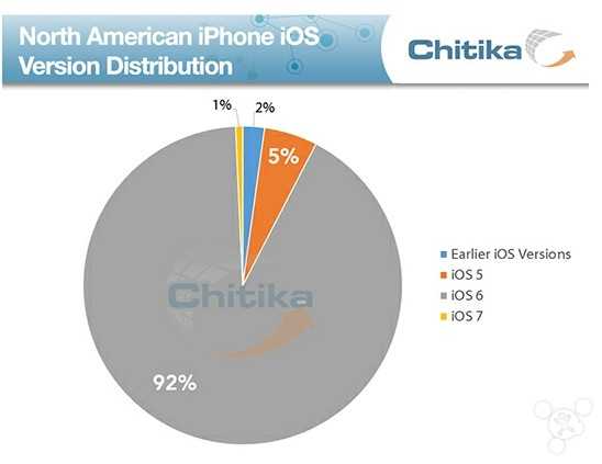 苹果 iOS 7 GM 或许会在今天的发布会之后放出,根据广告网络 Chitika 统计的数据,目前在北美,92% 的 iPhone 以及 82% 的 iPad 用户均已更新至苹果最新版本 iOS 6,而 iOS 5 的则分别是 5% 和 13%。