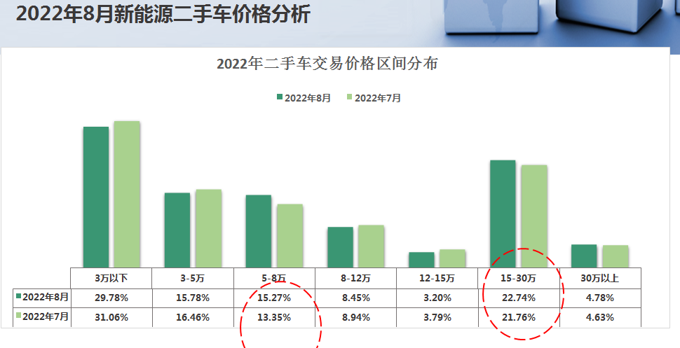 8 月份二手车均价持续走低,市场还处于相对不景气区间,交易不旺,价格没有上涨动力。二手燃油车价格持续下降,新能源交易价格分布整体有所上移,15 万元以上车型占比持续增加。