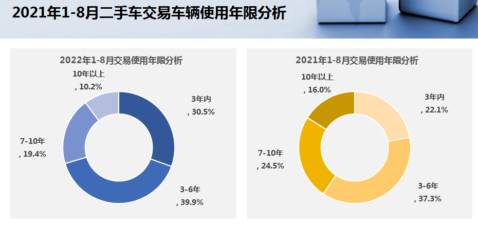 1-8 月,二手车使用年限在 3-6 年的交易量最多, 占比为 39.9%,较去年同期增加了 2.5 个百分点;使用年限在3年内车型占比为30.5%,较去年同期增加了8.4个百分点;车龄在7-10年的车型占比为19.4%,较去年同期减少了5个百分点;车龄10年以上的车型占比为10.2%,较去年同期减少了5.9个百分点。