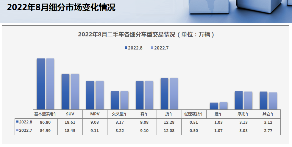 基本型乘用车共交易 86.80 万辆,环比增长 2.13%,同比下降 3.7%;SUV 共交易 18.61 万辆,环比增长 0.86%,同比增长 11.8%;MPV 共交易 9.03 万辆,环比下降 0.8%,同比增长 2.9%;交叉型乘用车共交易 3.17 万辆,环比下降 1.51%,同比下降 8.5%。