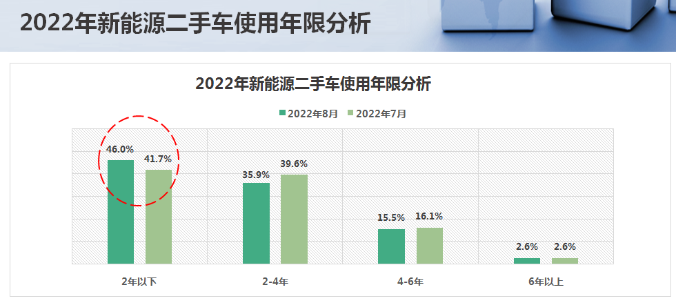 整体来看 8 月份,新能源二手车车龄较 7 月份有所减少,2 年以内的车型占比增长明显。