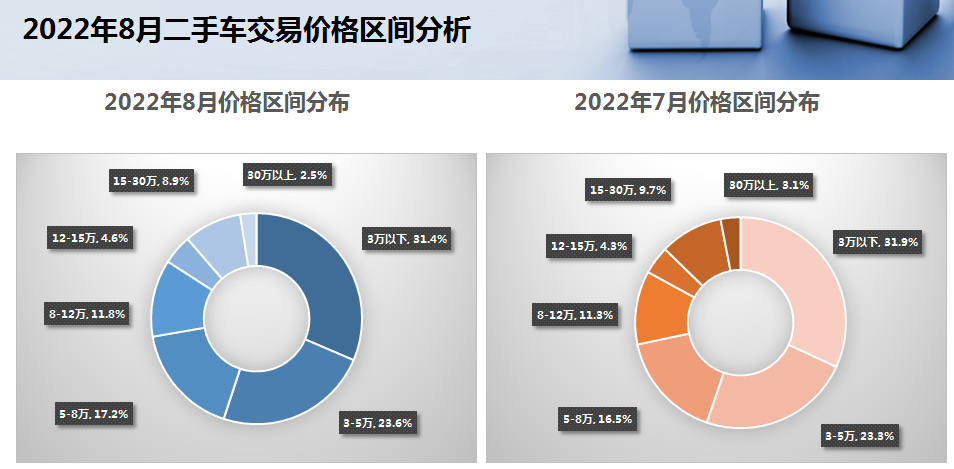 8 月,二手车交易价格区间在 3 万元以下的车辆市场占比最大,占比为 31.4%,环比下降了 0.5 个百分点。3-5万价格区间的车辆占比为23.6%,环比增加了0.3个百分点;30万元以上的二手车市场占比最小占2.5%,环比下降了0.6个百分点。8月份,3-5万、5-8万、8-12万、12-15万区间的二手车交易量占比小幅增加,其他价格区间交易量占比有所减少。
