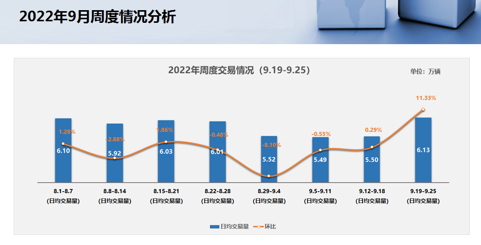 9 月第三周日均交易量为 6.13 万辆,环比上周增长 11.33%,与 8 月份同期相比增长 1.65%。第二周日均交易量为 5.50 万辆,与 8 月同期相比下降 7 个百分点;第一周日均交易 5.49 万辆,环比上周下降 0.5 个百分点,与 8 月同期相比下降了 7.26%;预计 9 月交易规模在 148-150 万辆左右,同比下降 4.76%。前三季度预计交易量在 1200 万辆,累计同比下降 7.5%。