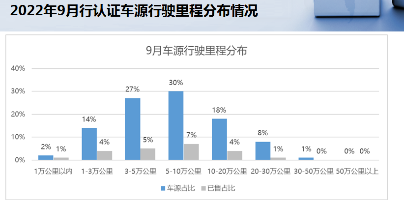 2022 年 9 月,“老旧车” 比例抬头,1-5 万公里内的数据较上月降低 3 个百分点,5-10 万区域增长 1 个百分点,20 万以上数据增长 2 个百分点。