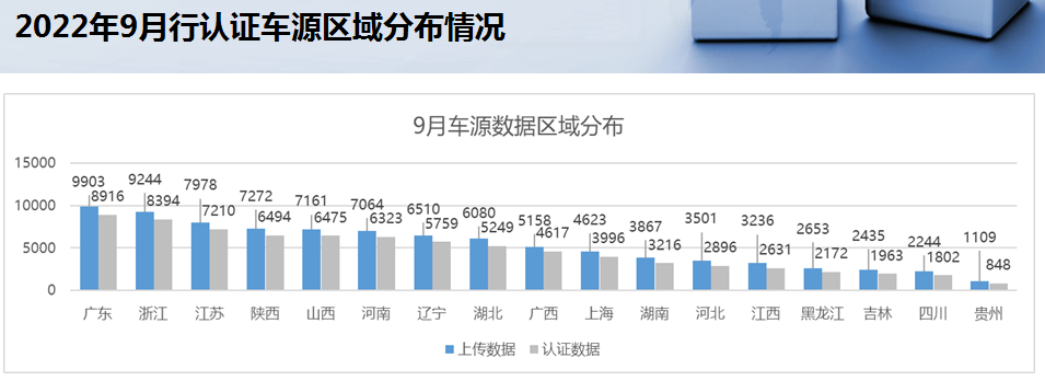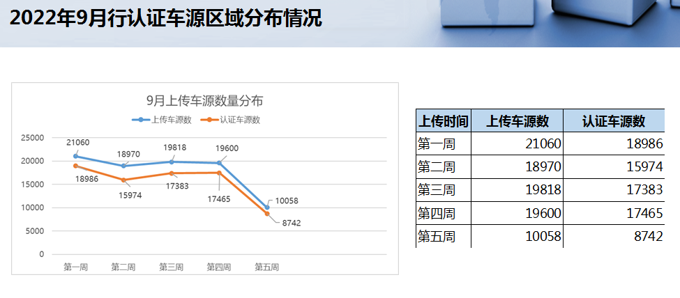 2022 年 9 月,行认证共接收到上传车源数据 89506,较 8 月份降低约 2%,其中符合行认证标准的车源数据 78550 较 8 月降低约 5%。其中,本月符合行认证数据占据提交总数的比例近 88%。