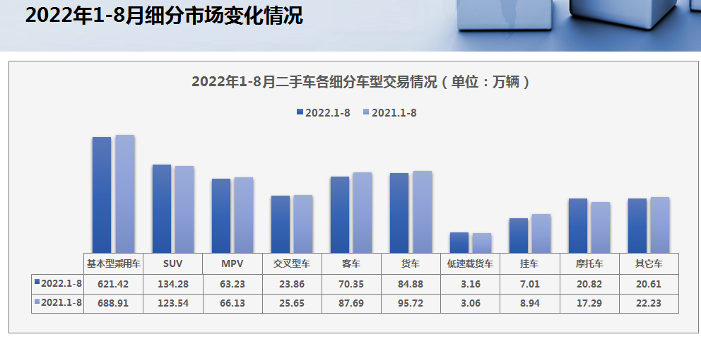 2022 年 1-8 月,全国二手车市场累计交易量 1049.6 万辆,同比下降 7.9%,比 1-7 月降幅收窄 0.8 个百分点。基本型乘用车共交易 621.42 万辆,同比下降 9.8%;SUV 共交易 134.28 万辆,同比增长 8.7%,比 1-7 月增长了 0.5 个百分点;MPV 共交易 63.23 万辆,同比下降 4.4%;交叉型乘用车共交易 23.86 万辆,同比下降 7%。