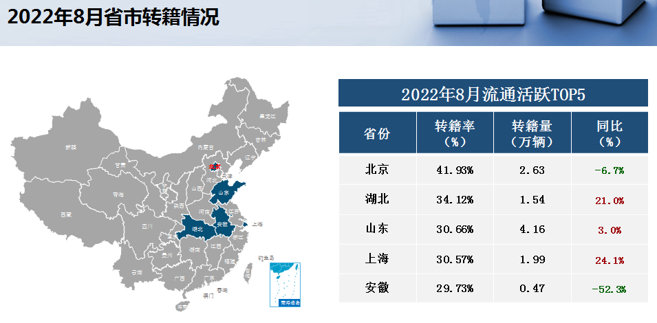 2022 年 8 月,全国转籍比例排名前五的省份是北京、湖北、山东、上海、安徽。其中北京转籍率最高为 41.93%,湖北、山东、上海三省转籍率超过 30%。具体从转籍量来看,湖北省增长最为明显,二手车转籍量同比增长 21%,转籍量为 1.54 万辆。其次是上海同比增长 24.1%,转籍量为 1.99 万辆。安徽较去年同期下降明显,同比下降了 52.3%,转籍量为 0.47 万辆。