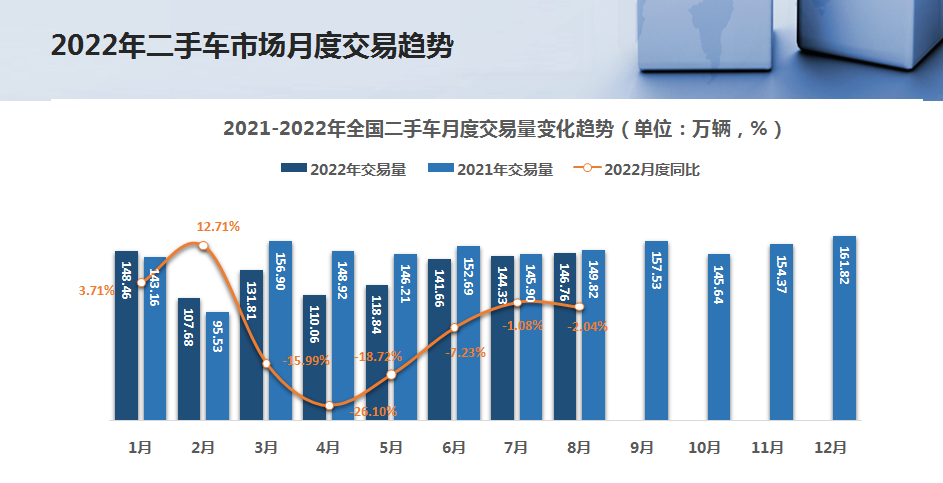 2022 年 8 月,全国二手车市场交易量 146.76 万辆,交易量环比增长 1.69%,同比下降 2.04%,交易金额为 956.6 亿元。