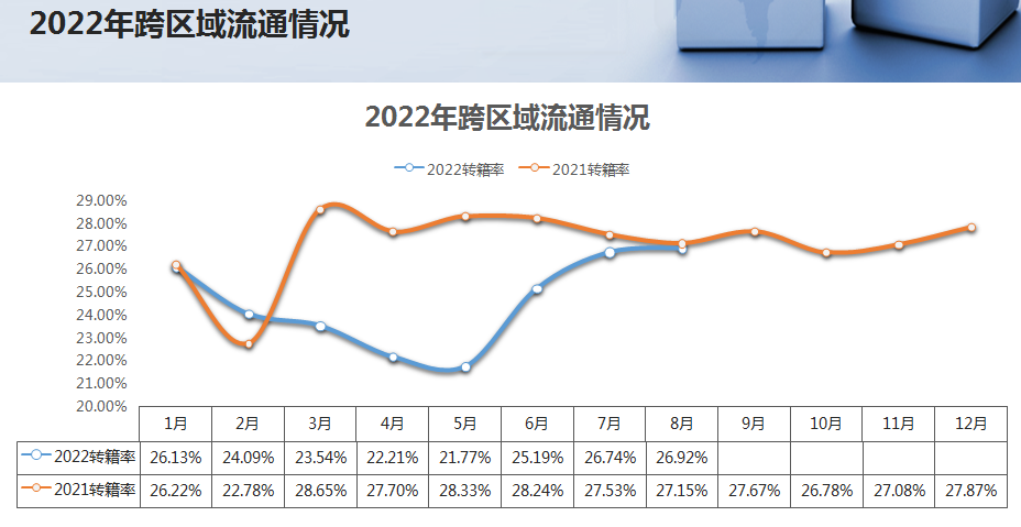 8 月份国内疫情形势严峻复杂,海南、西藏、四川、新疆等多地发生规模性疫情,全国防控措施进一步收紧。另一方面随着全面取消二手车限迁政策的大力推动,二手车跨区域流通逐渐通畅。整体来看 8 月份转籍情况小幅回升,二手车转籍率较 7 月份小幅增加了 0.2 个百分点,转籍率为 26.92%,较去年同期仍有小幅下降。今年以来疫情延宕反复,二手车市场的不确定因素较多,预计 9 月份全国二手车跨区域流通情况仍会持续好转。