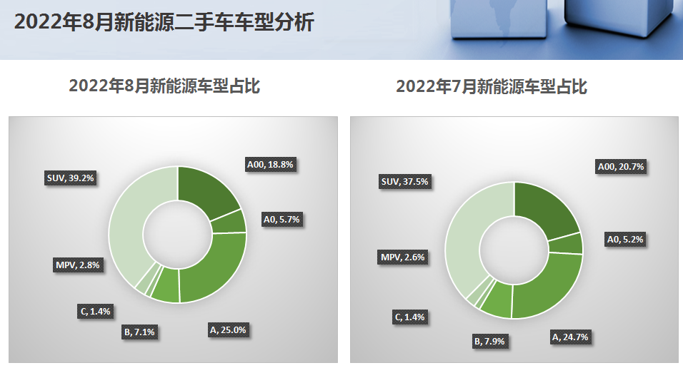 2022 年 8 月,全国新能源二手车中,A0 级、A 级、MPV、SUV 车型交易占比较上月有所增加,其余车型均有不同程度的减少,其中 SUV 车型占比增长最为明显,较上增加了 1.6%,占比为 39.2% 。A00 级车型占比下降了 1.9 个百分点,占比为 18.8%。C 级车型占 1.4%,较上月保持持平。