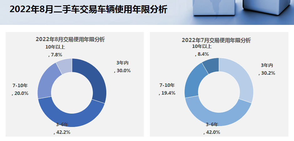 8 月,二手车使用年限在 3-6 年的交易量最多, 占比 42.2%,环比增加了 0.2 个百分点,较去年同期增加了 6.6 个百分点;使用年限在3年内车型占比为30%,环比下降了0.2个百分点,较去年同期增加了6.9个百分点;车龄在7-10年的车型占20%,环比增加了0.6个百分点,较去年同期减少了4.2个百分点;车龄10年以上的车型占比为7.8%,环比下降了0.6个百分点,较去年同期减少了9.3个百分点。