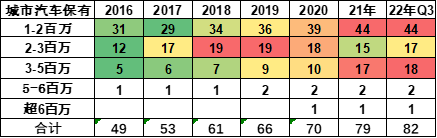 中国车市发展应该说以大城市发展为核心。车市普及主要随着人口的流入而持续的增长,因此超大城市和大型城市的车辆普及率相对增长较快,超过500万保有量的城市目前已经有3个。截至9月底,全国有82个城市的汽车保有量超过100万辆,同比2021年末增加3个城市,38个城市超过200万辆,21个城市超过300万辆。