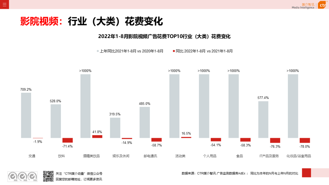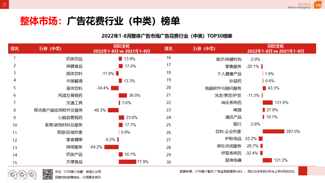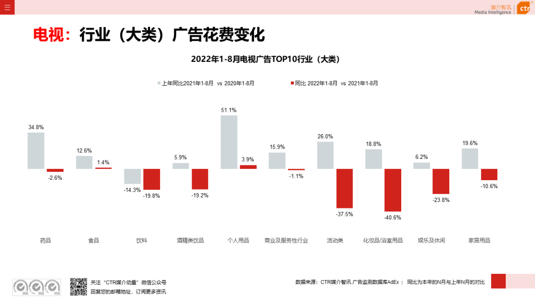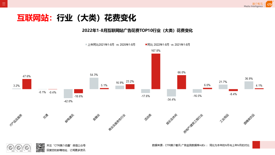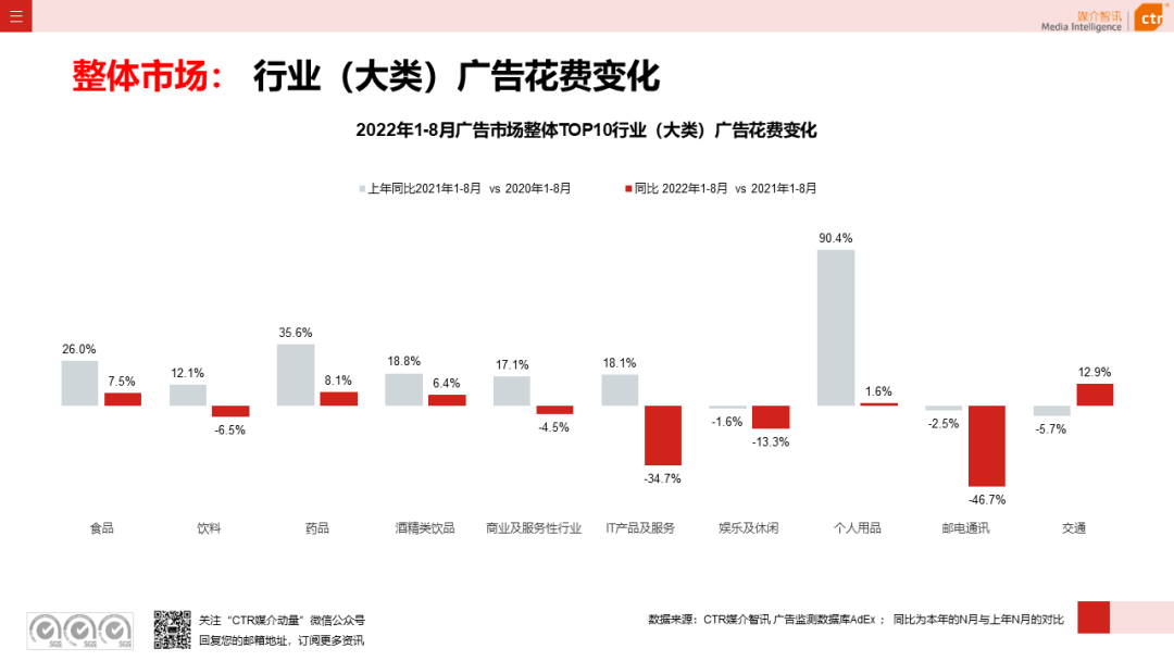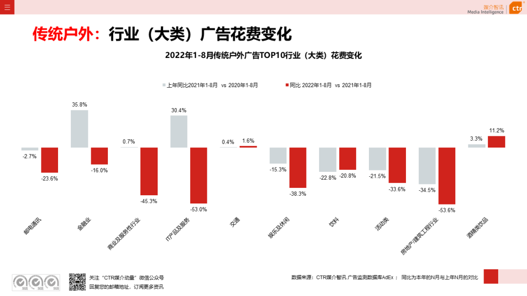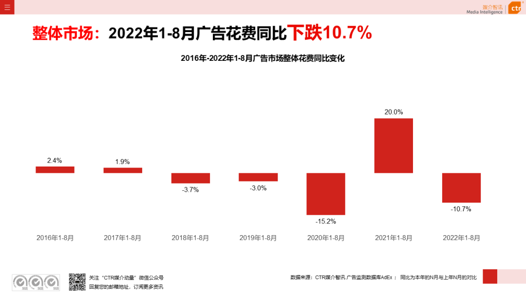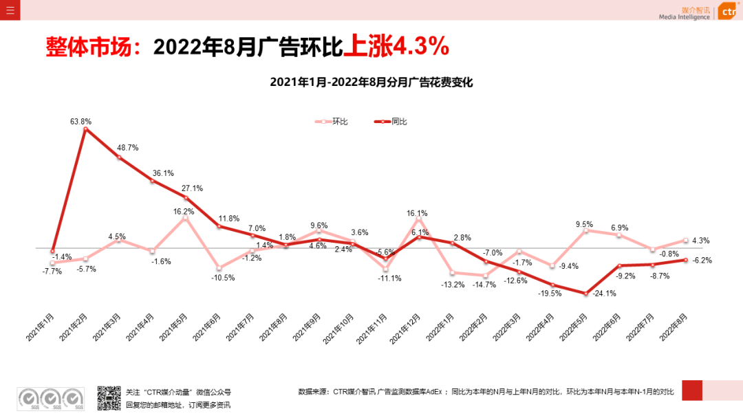 根据CTR媒介智讯的数据显示,2022年1-8月广告市场同比减少10.7%。自6月起,月度广告市场花费同比跌幅持续收窄,8月广告花费同比下跌6.2%;月度花费环比呈现正增长,上涨4.3%。
