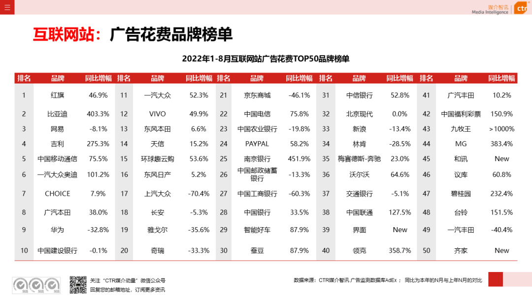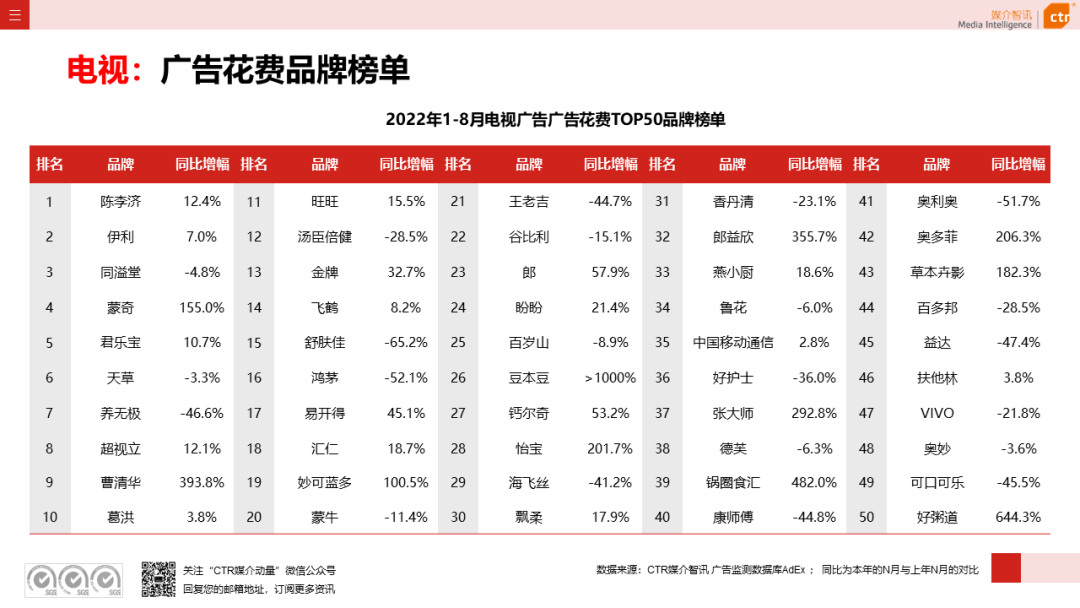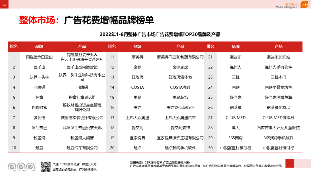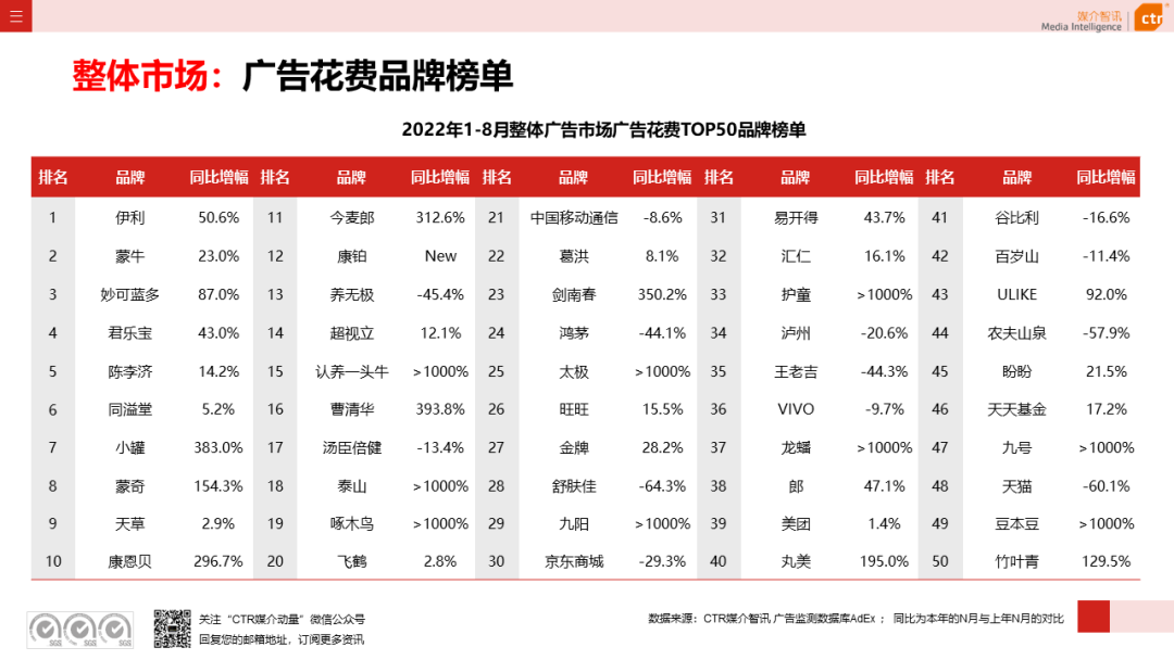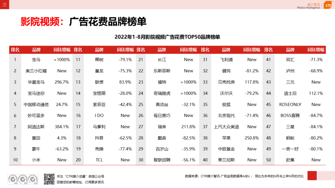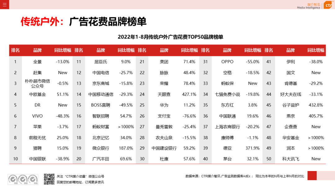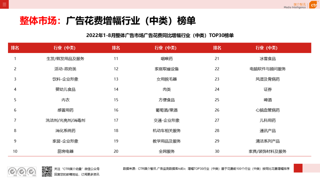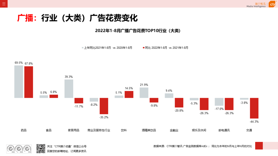 根据CTR媒介智讯的数据显示,2022年1-8月广告市场同比减少10.7%。自6月起,月度广告市场花费同比跌幅持续收窄,8月广告花费同比下跌6.2%;月度花费环比呈现正增长,上涨4.3%。