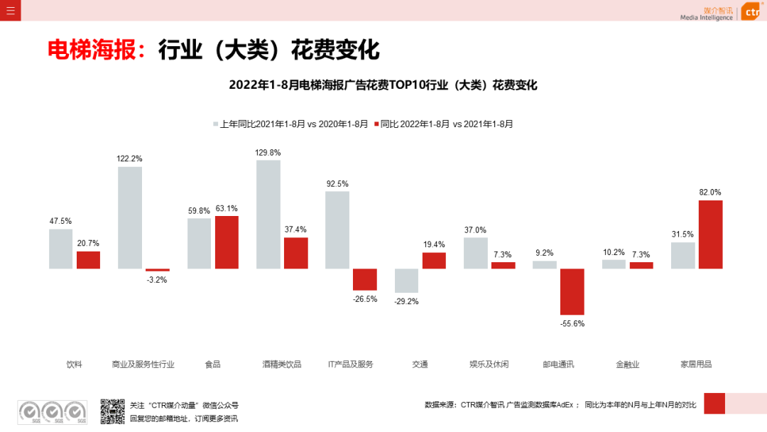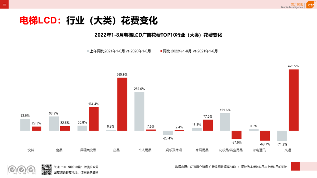 交通行业广告花费同比持续上涨,增幅为12.9%,在传统户外、电梯LCD和电梯海报有的广告花费同比增幅分别为1.6%、428.5%和19.4%。汽油/燃油/润滑油、自行车/电动自行车等品类的持续大幅增投广告,是带动电梯LCD花费迅猛增长的主因。增投突出的品牌包括龙蟠、九号、IM智己、岚图、梅赛德斯–奔驰等。
