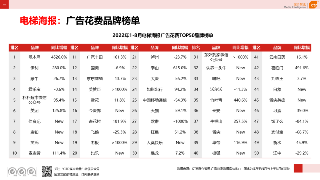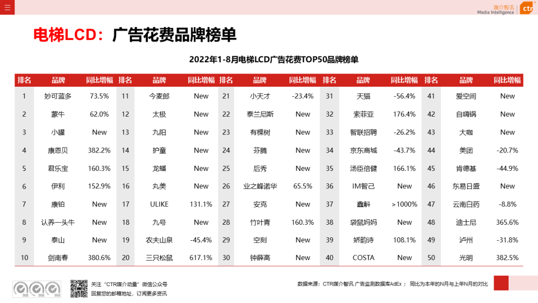 2022年1-8月广告市场头部行业榜单中,食品行业花费同比上涨7.5%,在电视、广播、电梯广告渠道均呈现增投。尤其在电梯LCD和电梯海报同比分别增长32.6%和63.1%,行业内奶类产品、冰雪食品、方便食品、零食糖果、保健食品等各品类的加大投放是电梯广告渠道花费上涨的源由。重点品牌中,妙可蓝多、伊利、三只松鼠、空刻、钟薛高等品牌在电梯LCD的广告投放突出;电梯海报的食品行业头部品牌则有信良记、英氏、蒙牛、比乐、人类快乐等,而且这五个品牌均是今年新增投放电梯海报广告。此外,保健食品和方便食品在电视媒体投放活跃,增投突出的品牌有钙尔奇、香丹清、燕小厨、小仙炖、奥多菲。