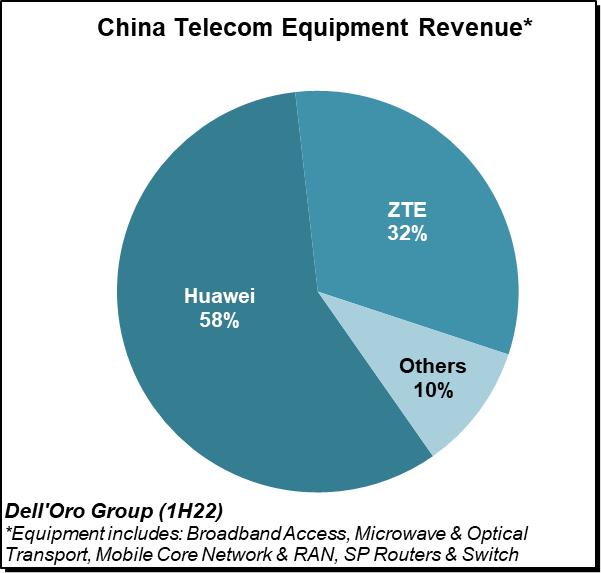 从2021年到2022年上半年,供应商的动态相对稳定,Top 7供应商占据了整个市场约80%的份额。尽管华为在2022年上半年受益于其在中国市场的领导地位,但该公司在中国以外市场的收入份额下降可以忽略不计——Dell’Oro Group估测华为在2022年上半年的市场份额为28%。