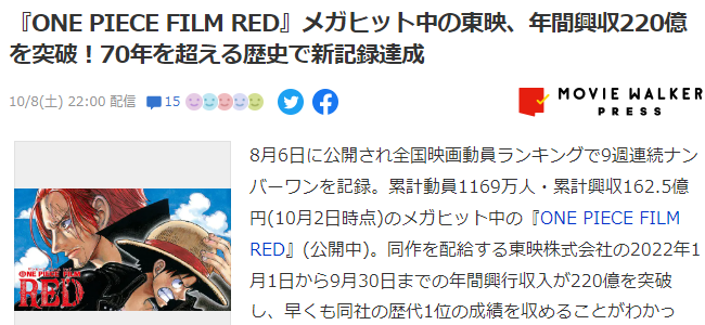 •今年除了《海贼王:红发歌姬》贡献了最大头的票房收入外,其他如《牛首村》、《龙珠超 超级英雄》等大片同样反响热烈,最终截止目前的2022年 年间票房已达220亿日元,刷新了公司成立72周年的新纪录。