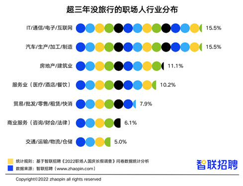 大多数职场人受限于工作而无法出门旅行,这个长假也成了难得的喘息时间。数据显示,6.6%的职场人已经超过3年没有出门旅行,即每15个职场人就有1个超过3年没有体验“诗和远方”。从行业层面来看,IT/通信行业、汽车/制造业和房地产建筑业的职场人工作繁忙程度登顶Top3,分别有15.5%、15.5%和11.1%的行业从业者超过3年没有放下工作去旅行。