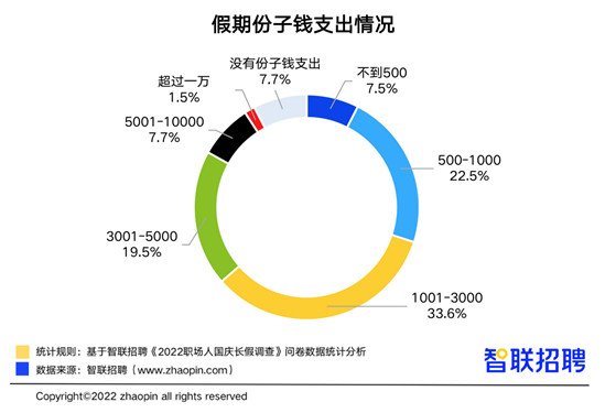 假期份子钱同样是职场人难以避免的话题,这个假期仅有7.7%的职场人没有份子钱支出,受访职场人平均给出份子钱¥2369。其中,给出1001-3000的职场人最多,占比高达33.6%。