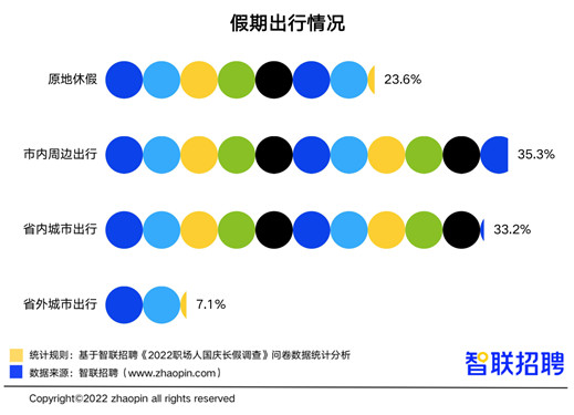 从调研数据来看,这个国庆假期,受访职场人仅有23.6%选择原地休假。市内周边出行、省内城市出行以35.3%、33.2%的比例成为职场人休假首选。由此可见,出行游玩仍为国庆假期主旋律。